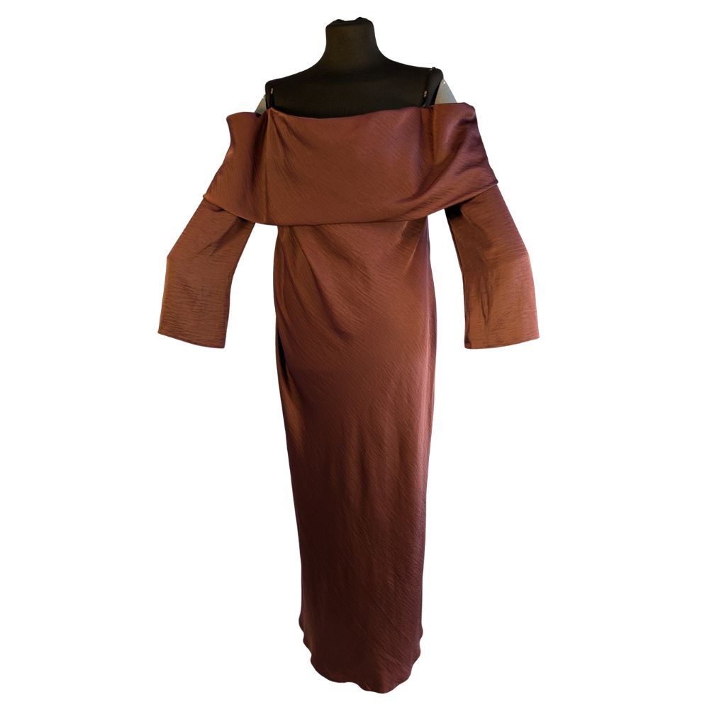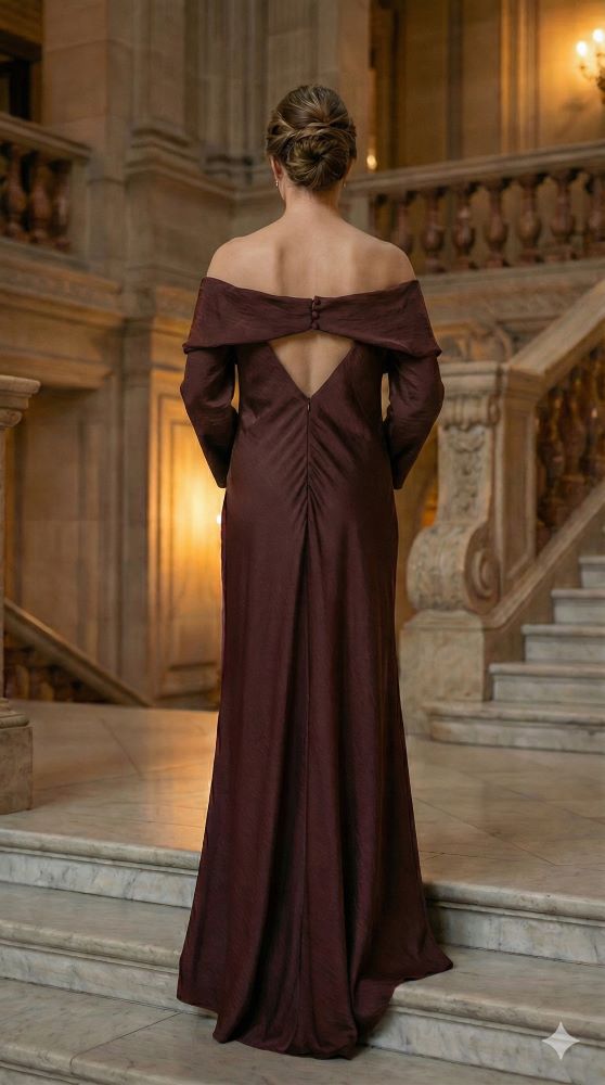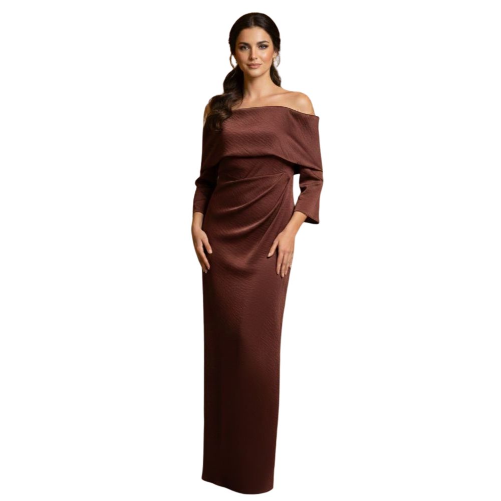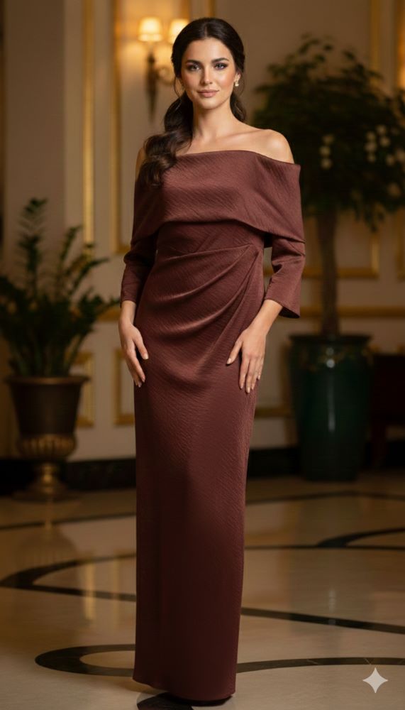 "To absolutny hit sezonu w wyjątkowej cenie outletowej. Czekoladowy brąz to nowa czerń – niezwykle szlachetny i elegancki. Strategicznie rozmieszczone drapowania w okolicy talii i bioder sprytnie modelują sylwetkę, zapewniając maksymalny komfort i pewność siebie podczas każdego eleganckiego wyjścia."