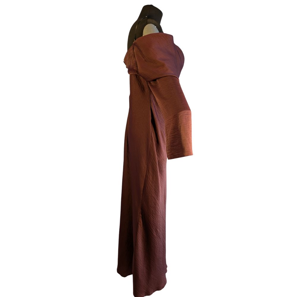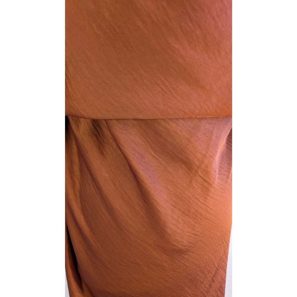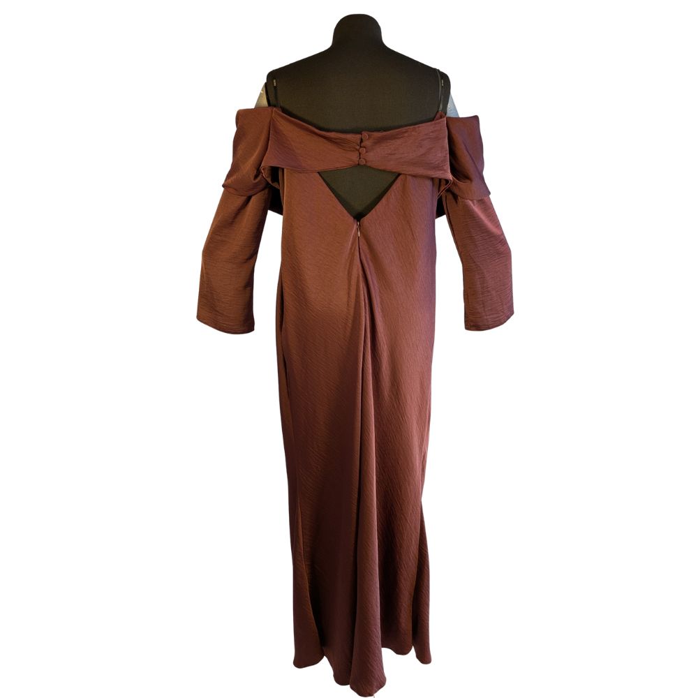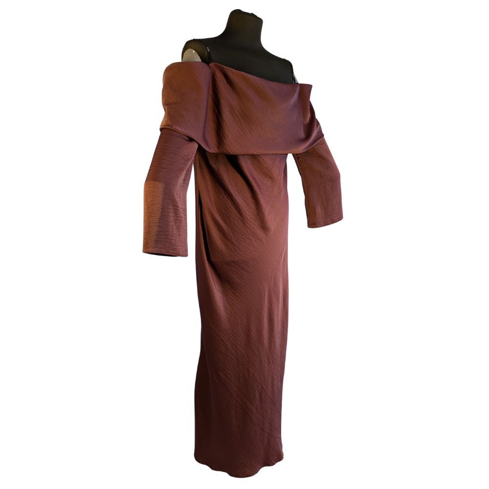 "To absolutny hit sezonu w wyjątkowej cenie outletowej. Czekoladowy brąz to nowa czerń – niezwykle szlachetny i elegancki. Strategicznie rozmieszczone drapowania w okolicy talii i bioder sprytnie modelują sylwetkę, zapewniając maksymalny komfort i pewność siebie podczas każdego eleganckiego wyjścia."