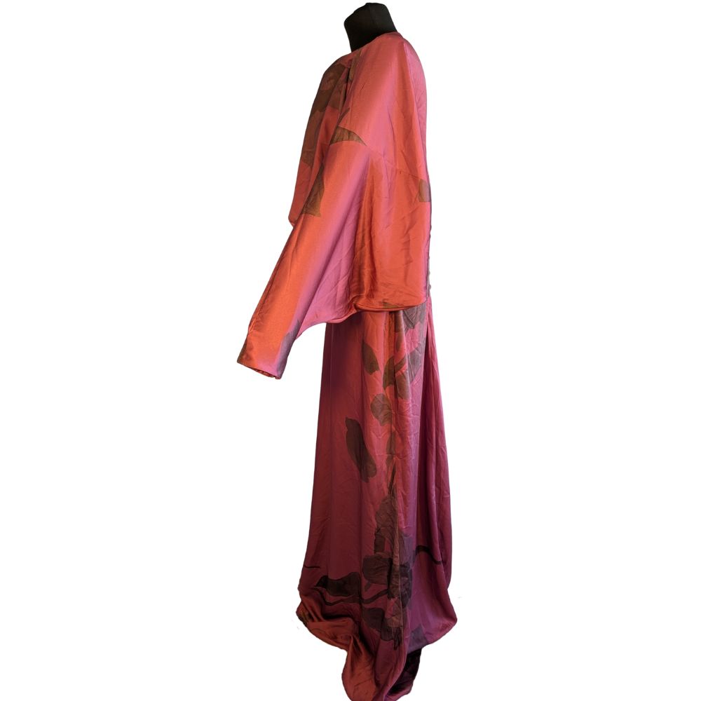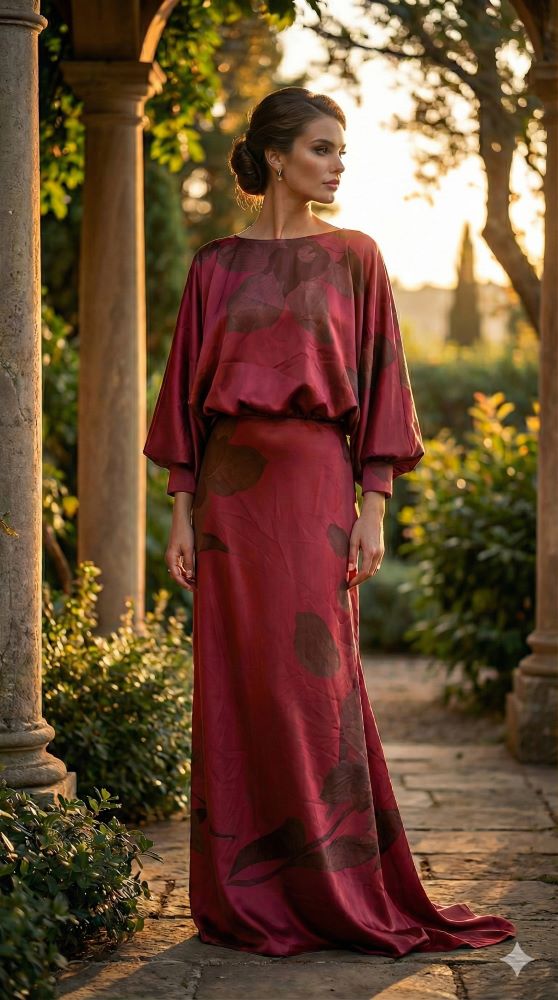 "To kreacja stworzona na wielkie wyjścia. Oferujemy ją w wyjątkowej cenie outletowej – to absolutna okazja dla Pani szukającej klasy premium. Długość maxi (160 cm) zapewnia dostojną prezencję, a luźna góra typu nietoperz sprytnie maskuje ramiona, jednocześnie pięknie eksponując linię talii."