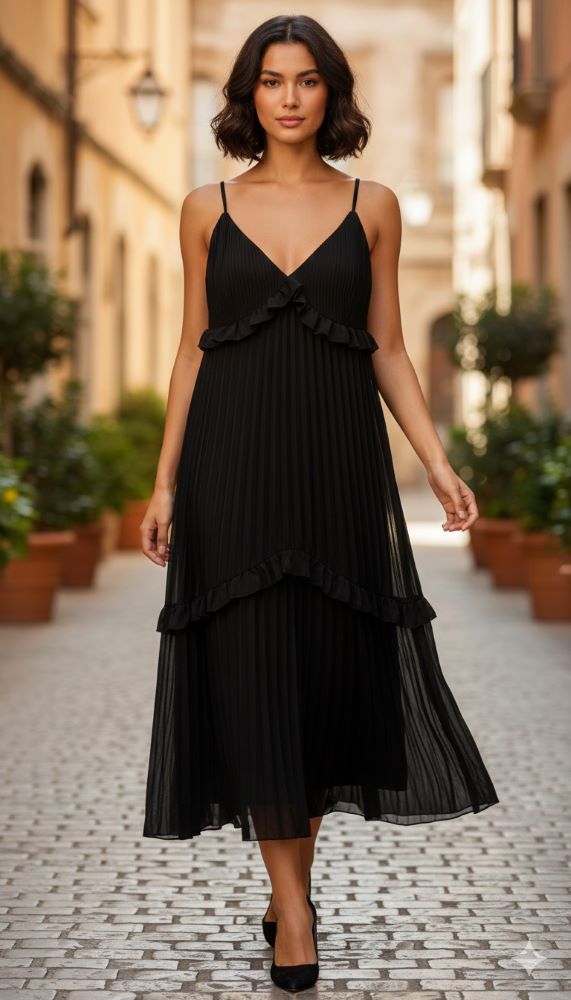 "To klasyczna 'mała czarna' w wydaniu Plus Size. Swobodny krój i pionowe plisy sprytnie modelują sylwetkę, a czarny kolor optycznie wysmukla. Dzięki falbanom sukienka nabiera lekkości, co czyni ją idealnym wyborem zarówno na letnie przyjęcie, jak i na romantyczną randkę."
