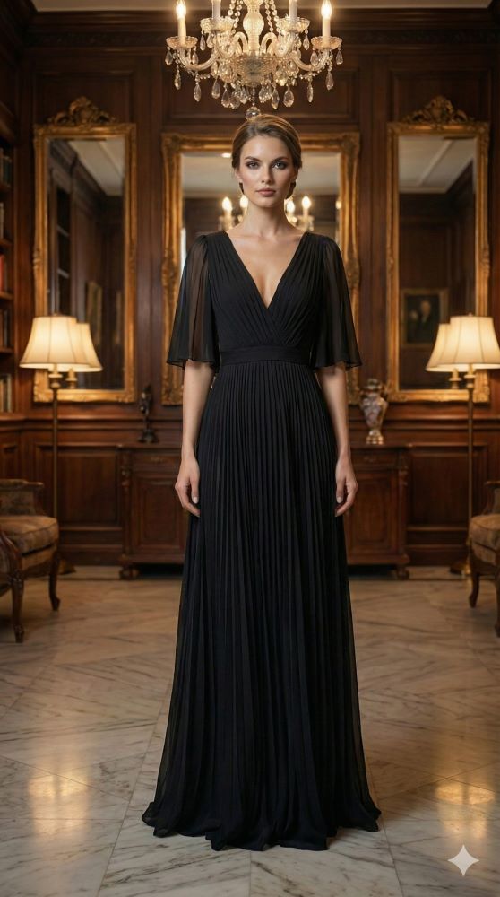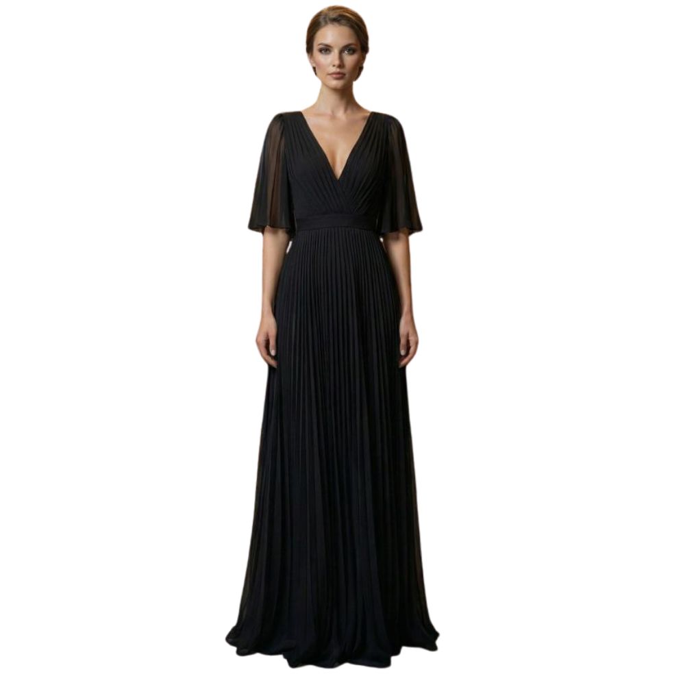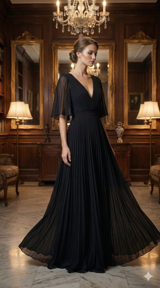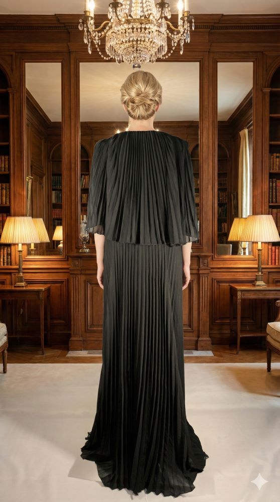 "To kreacja, która robi wrażenie 'wow' przy minimalnym wysiłku. Luźne rękawy typu Cape to idealne rozwiązanie dla kobiet pragnących subtelnie zakryć ramiona, zachowując przy tym lekkość i zwiewność całej sylwetki. Klasyczna czerń w połączeniu z gęstym plisowaniem optycznie wysmukla i dodaje niezwykłego szyku podczas każdego kroku."
