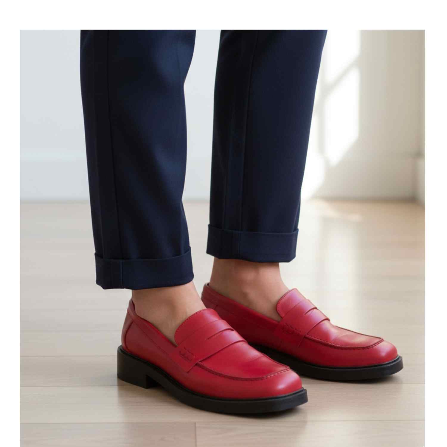 Klasyczne loafersy marki Topshop w odcieniu soczystej czerwieni to propozycja dla kobiet szukających luksusowych dodatków z charakterem. Wyprodukowane w Hiszpanii z najwyższej jakości skóry naturalnej, łączą w sobie tradycyjne rzemiosło z nowoczesnym fasonem. Mokasyny posiadają modny, lekko kwadratowy nosek oraz stabilny obcas o wysokości 4 cm, co zapewnia idealny balans między elegancją a komfortem podczas całodziennego noszenia.