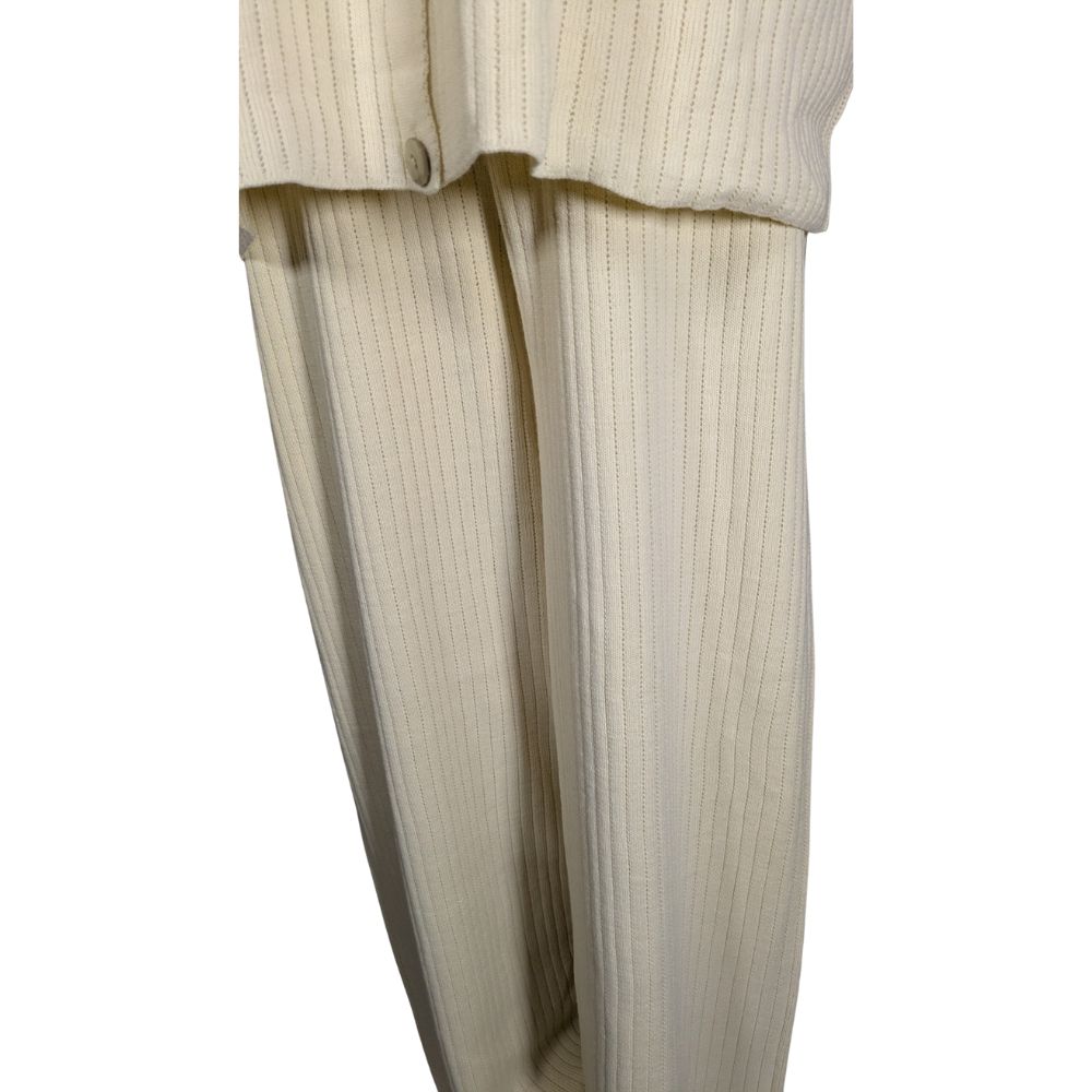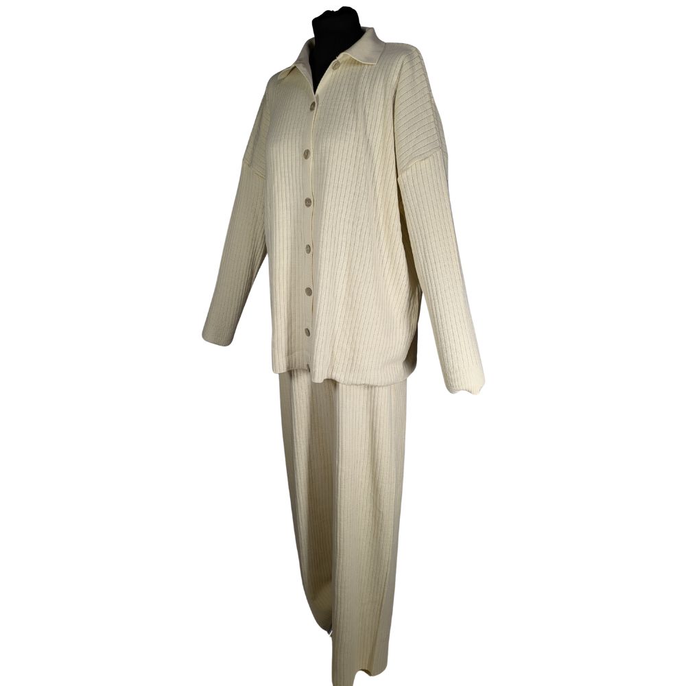 Komplet od Alaçatı Stili to idealne połączenie domowego luzu z miejskim stylem. Dzianina w odcieniu klasycznego kremu o pionowym splocie optycznie wysmukla sylwetkę, a luźny fason zapewnia pełną swobodę ruchów. To zestaw, który sprawdzi się zarówno podczas weekendowego wypoczynku, jak i na nieformalnym spotkaniu przy kawie.