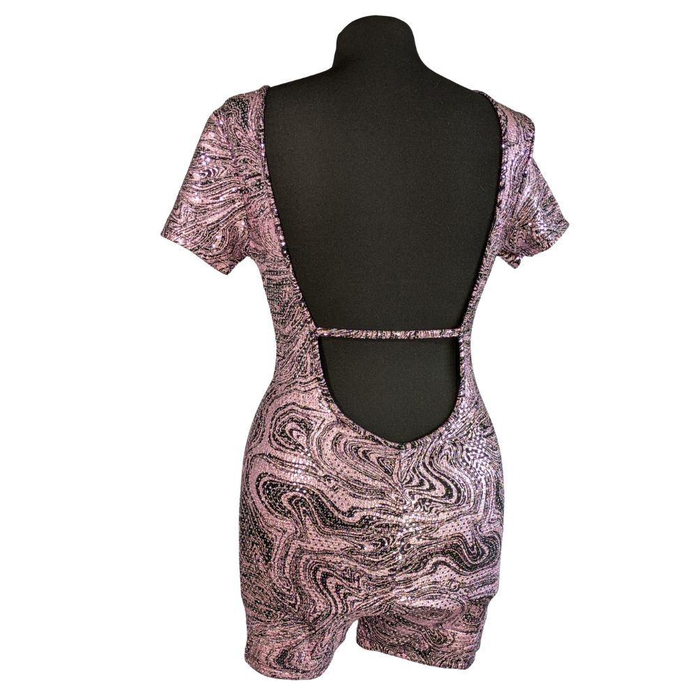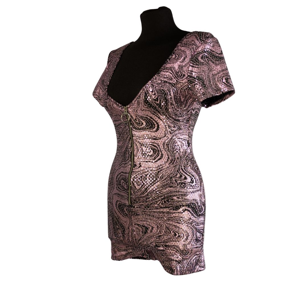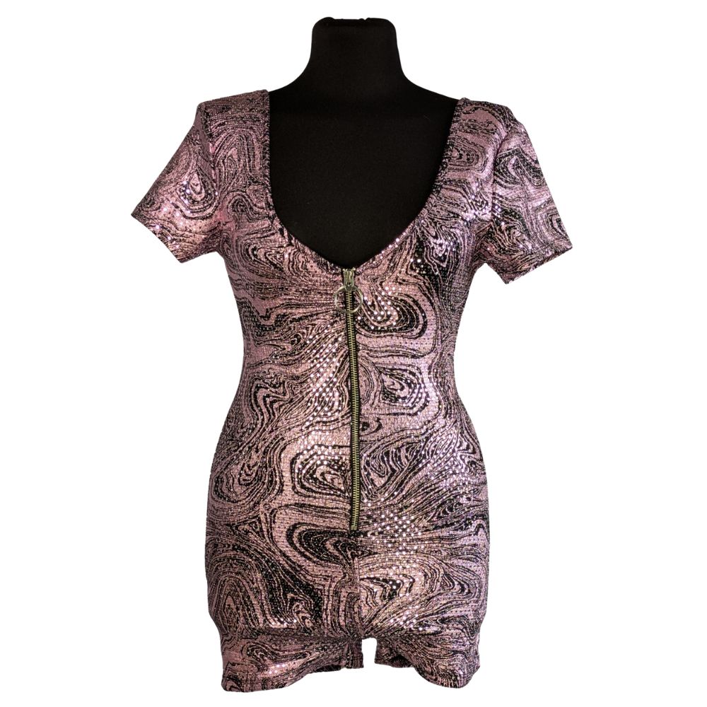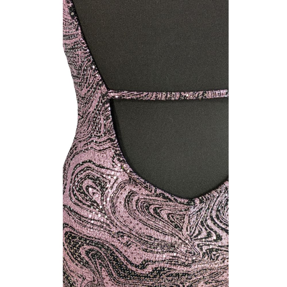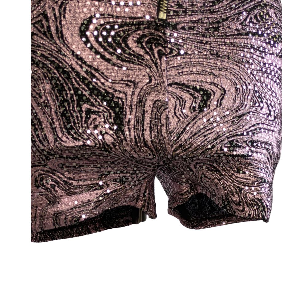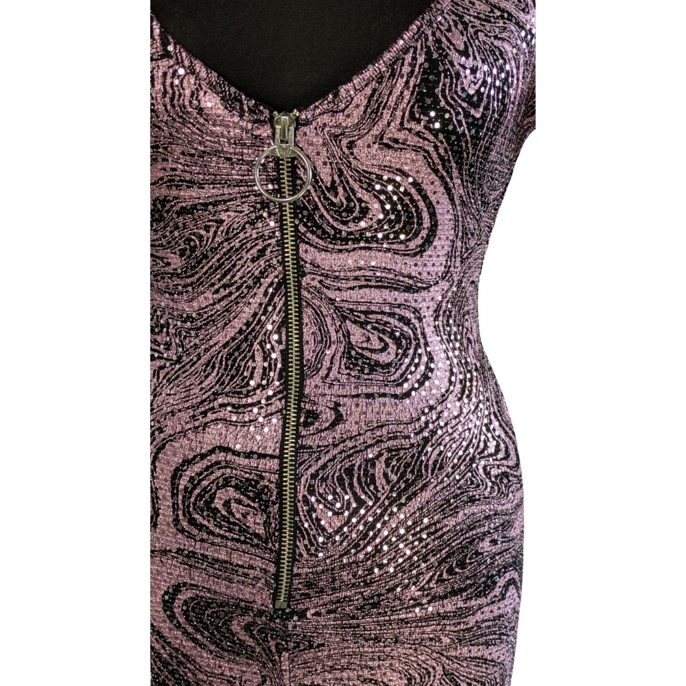 Romper marki AsYou to propozycja stworzona z myślą o nocnym życiu i wyjątkowych okazjach. Hipnotyzujący wzór typu "swirl" w odcieniach różu i fioletu został wzbogacony o metalizowane nici, które lśnią przy każdym ruchu. Krótki fason eksponuje nogi, a dopasowana góra z dekoltem V podkreśla atuty sylwetki.