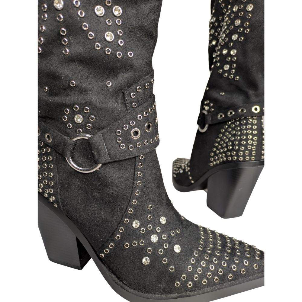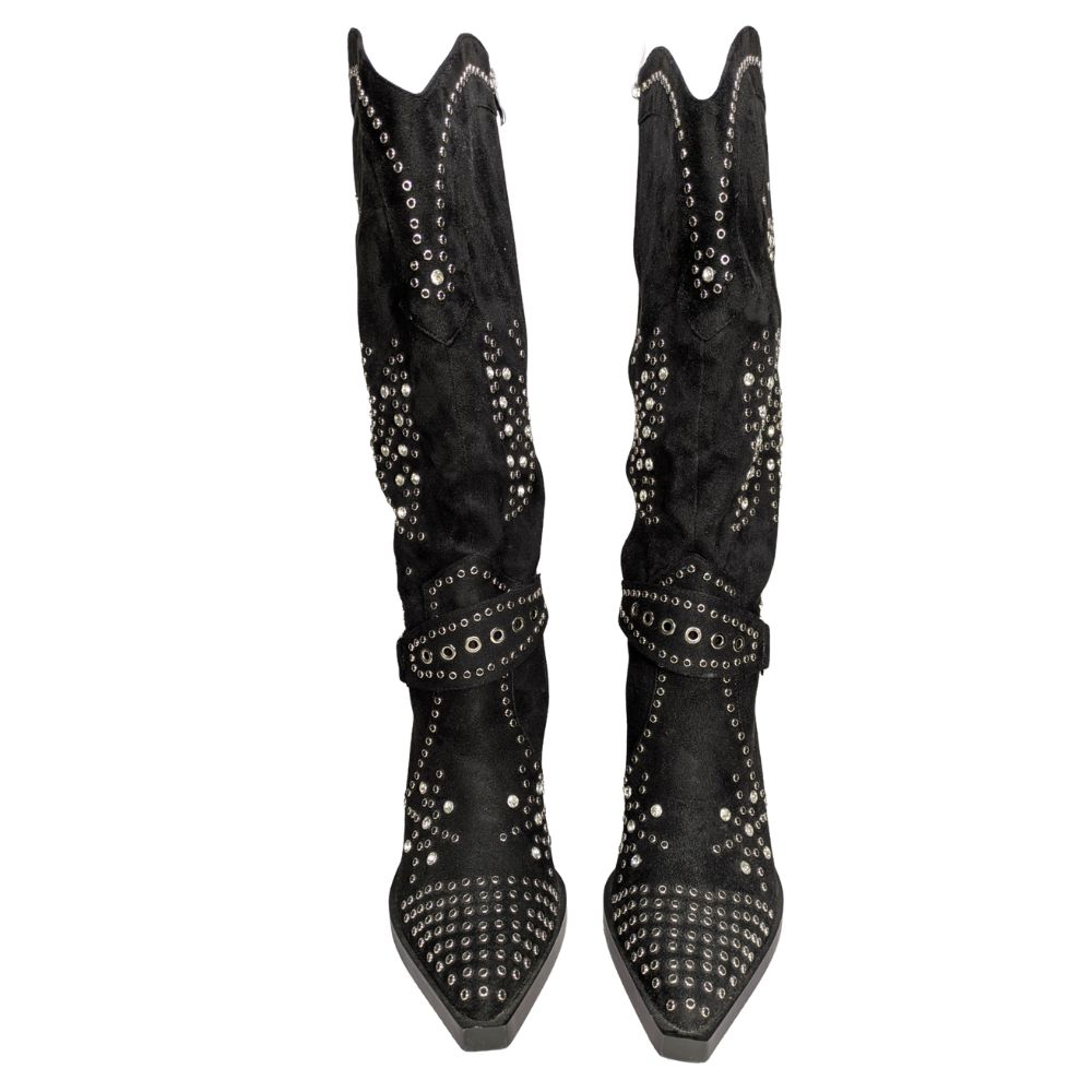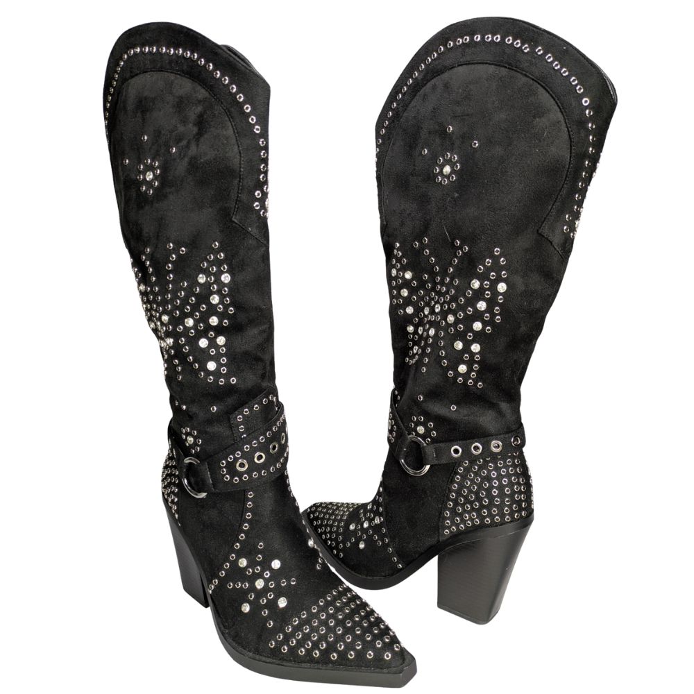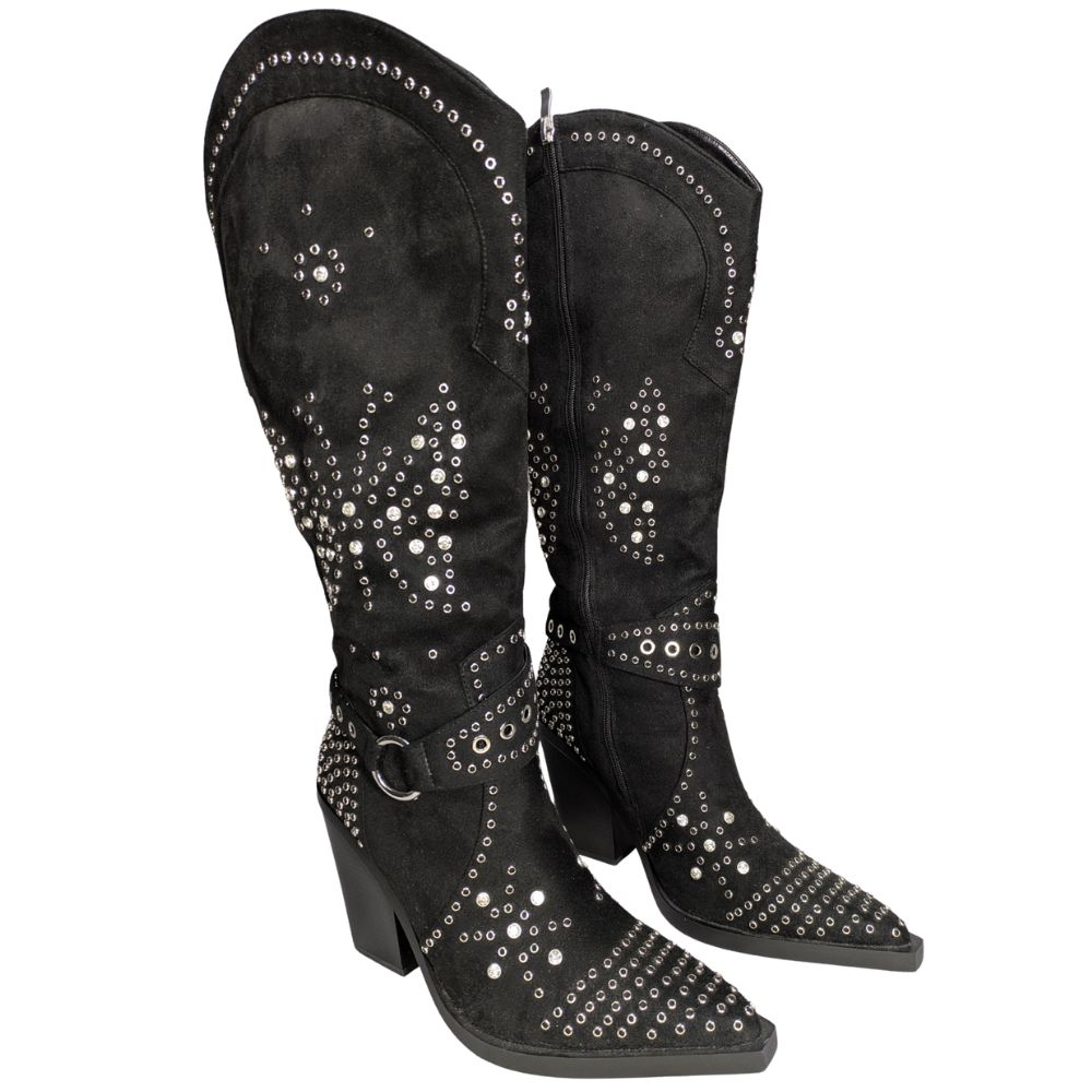 Te unikalne kowbojki wyróżniają się precyzyjnie zaprojektowanym wzorem z ćwieków i kryształków, które na boku cholewki układają się w kształt motyla. Wykonane z miękkiego, czarnego ekozamszu, posiadają spiczasty nosek (pointed toe) oraz imponujący obcas typu słupek o wysokości 11 cm. Boczny zamek błyskawiczny ułatwia zakładanie cholewki, która sięga do połowy łydki (wysokość 37 cm). To idealny wybór na wieczorne wyjścia, festiwale czy sesje zdjęciowe.