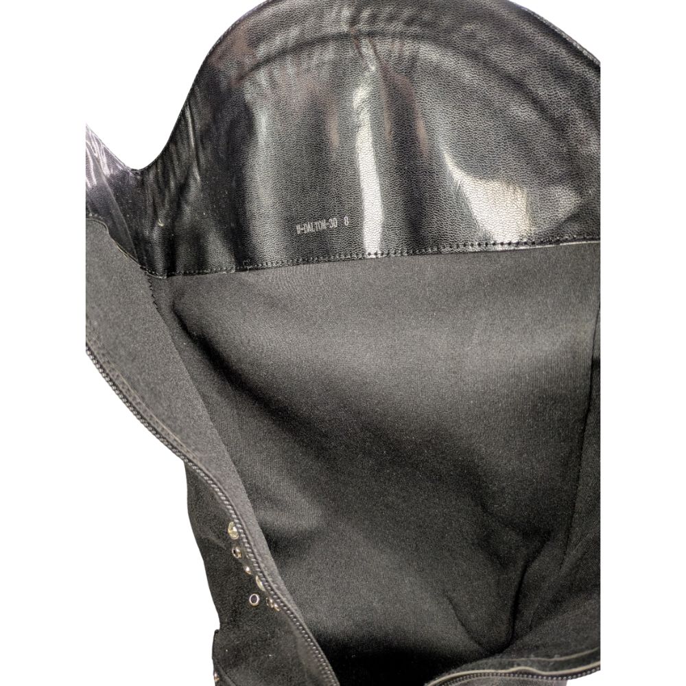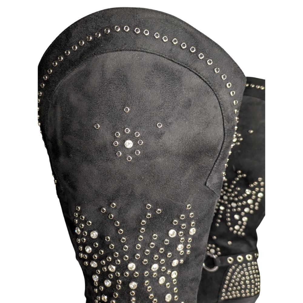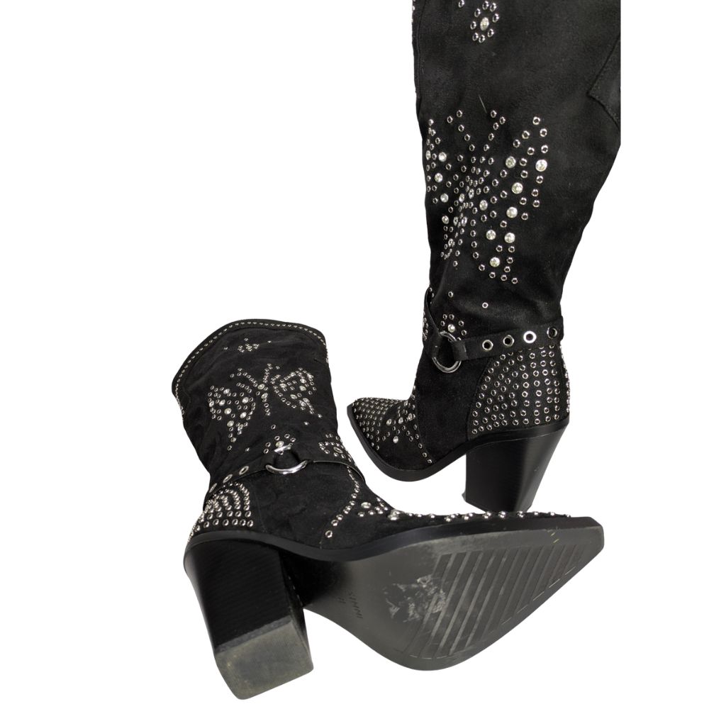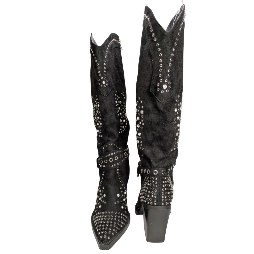 Te unikalne kowbojki wyróżniają się precyzyjnie zaprojektowanym wzorem z ćwieków i kryształków, które na boku cholewki układają się w kształt motyla. Wykonane z miękkiego, czarnego ekozamszu, posiadają spiczasty nosek (pointed toe) oraz imponujący obcas typu słupek o wysokości 11 cm. Boczny zamek błyskawiczny ułatwia zakładanie cholewki, która sięga do połowy łydki (wysokość 37 cm). To idealny wybór na wieczorne wyjścia, festiwale czy sesje zdjęciowe.