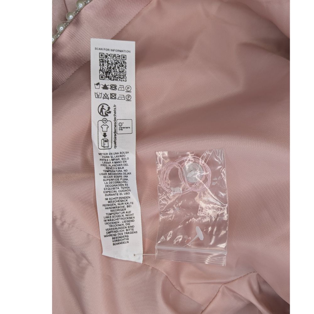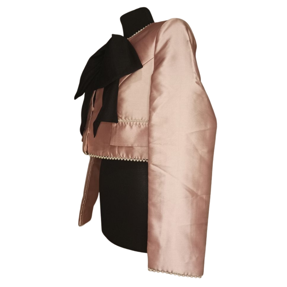Połączenie pudrowego różu, pereł i kontrastowej kokardy tworzy żakiet, który staje się centralnym punktem wizytowej stylizacji.