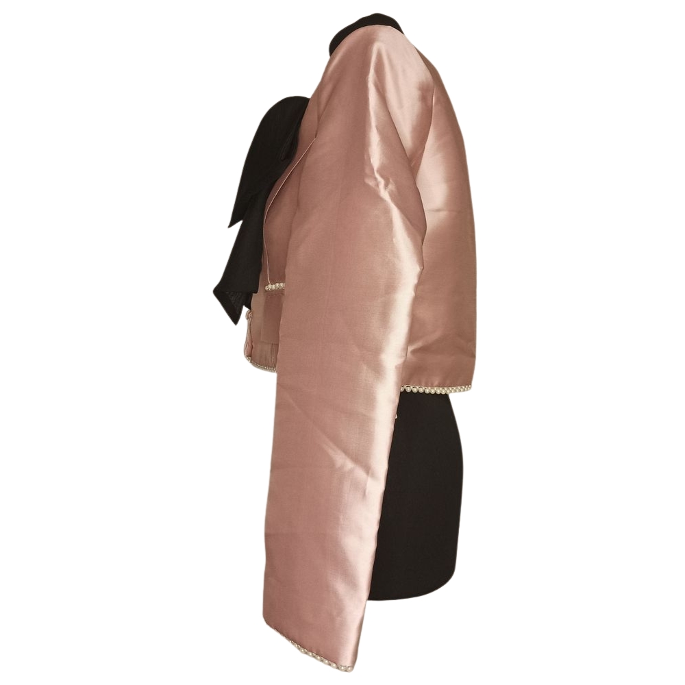 PobraniePołączenie pudrowego różu, pereł i kontrastowej kokardy tworzy żakiet, który staje się centralnym punktem wizytowej stylizacji.