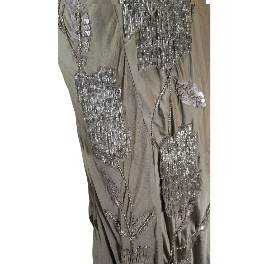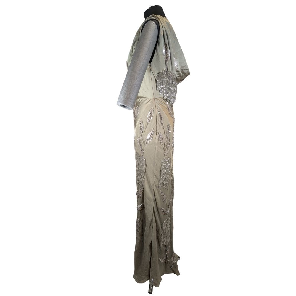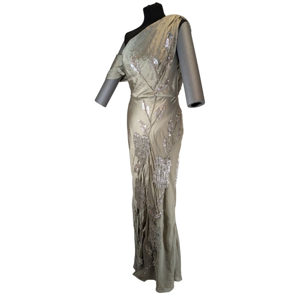 Projekt o numerze 138746134 wyróżnia się asymetrycznym fasonem na jedno ramię, który eksponuje szyję i dekolt. Całość została pokryta misternym haftem z koralików układającym się w roślinne motywy, dopełnionym kaskadami srebrzystych frędzli. Suknia posiada boczne zapięcie na zamek, co zapewnia idealne dopasowanie do sylwetki.