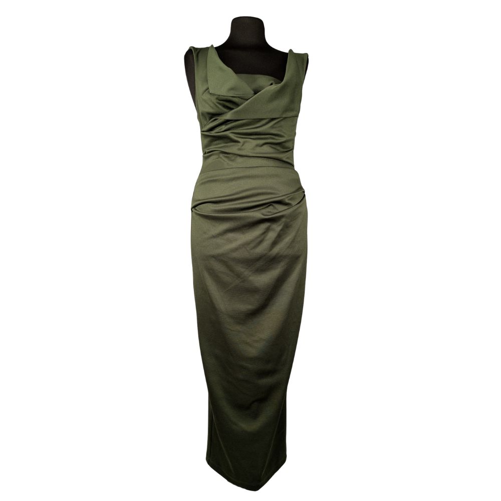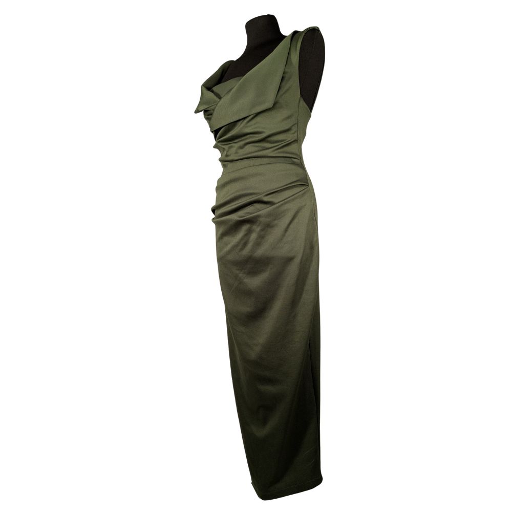 Suknia maxi od ASOS DESIGN to połączenie minimalistycznej formy z kunsztownym detalem. Drapowany dekolt i szlachetny odcień zieleni tworzą kreację idealną na uroczyste gale i wieczorowe wyjścia.