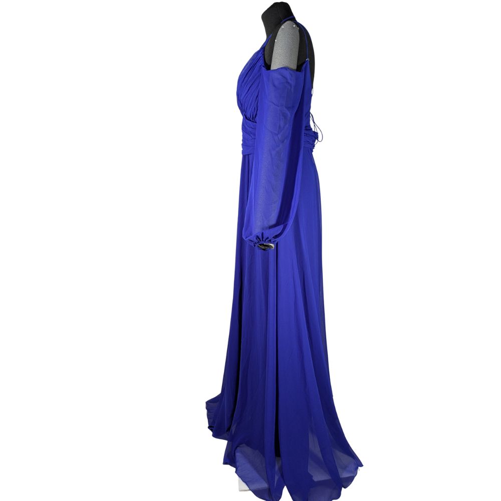 Suknia od marki She Wella to kwintesencja wieczorowego szyku. Połączenie lekkiego szyfonu, misternych drapowań i intensywnego chabrowego odcienia tworzy kreację, która zachwyca na każdej uroczystości.