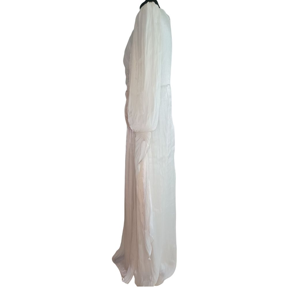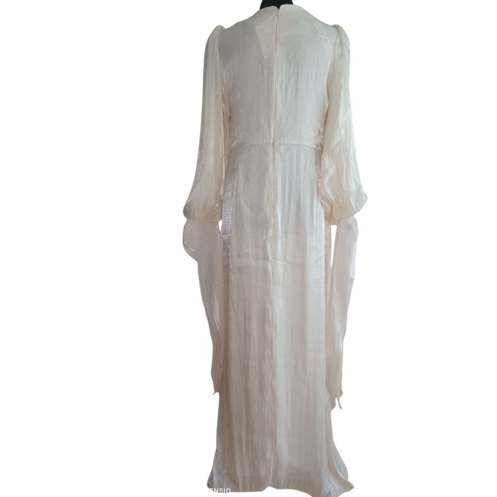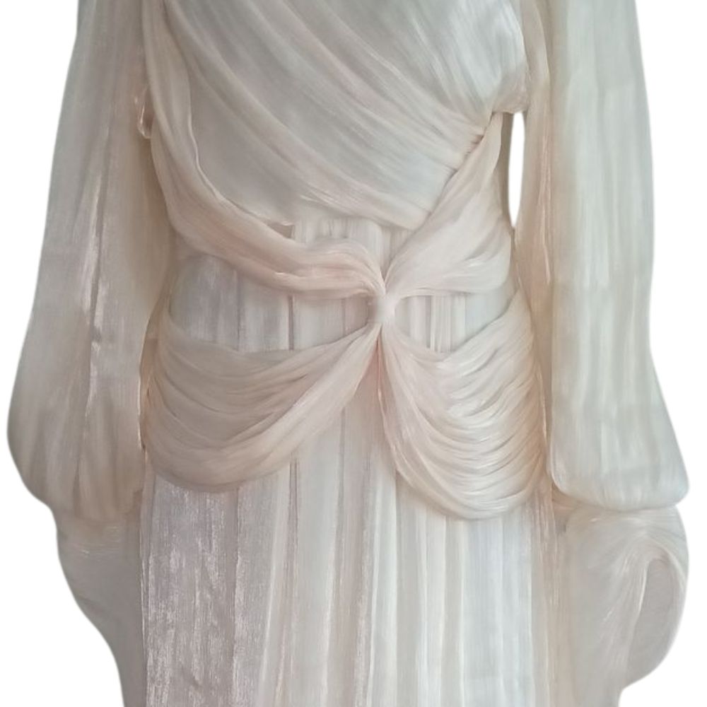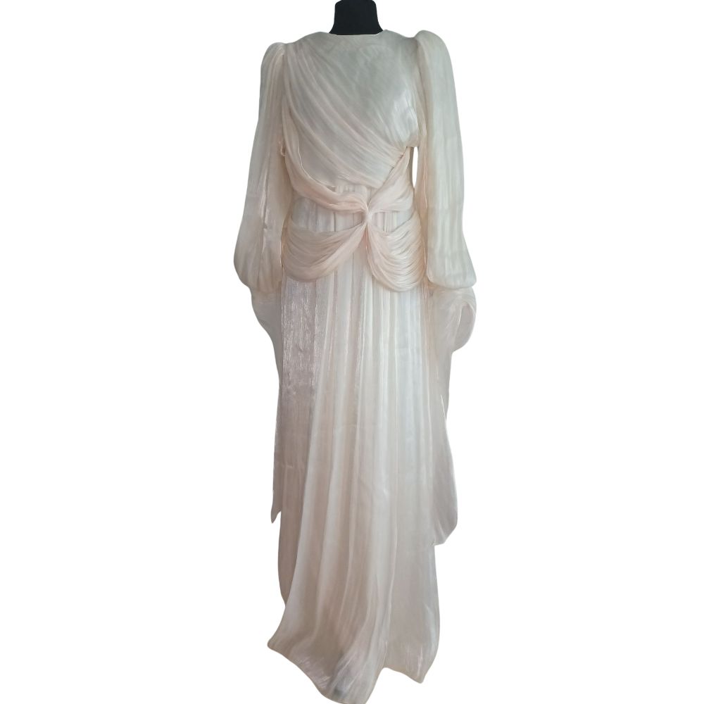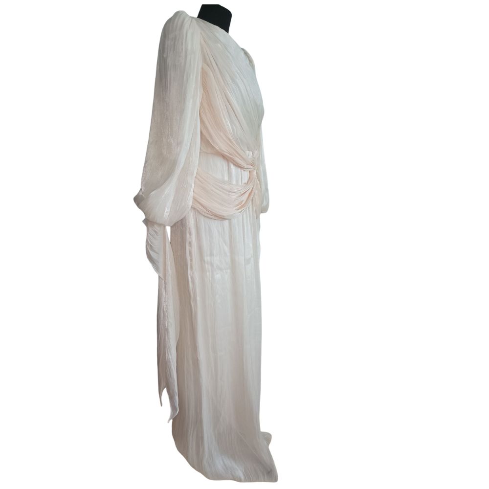 Głównym punktem architektonicznej konstrukcji tej sukni jest misterne, supełkowe drapowanie w okolicach pasa. Genialnie zbiera ono materiał, modelując talię i optycznie wysmuklając całą sylwetkę. Dodatkowy urok zapewniają długie, obszerne rękawy zakończone delikatnymi mankietami, które potęgują eteryczny charakter stroju.