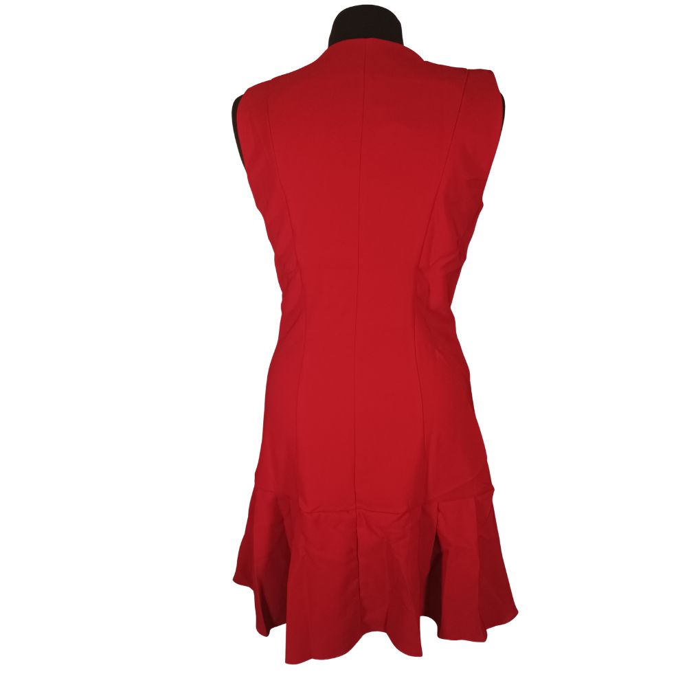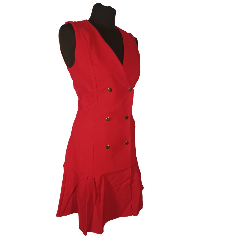 Górna część sukienki nawiązuje do klasycznej elegancji dwurzędowych marynarek – wyrazisty dekolt w kształcie litery V świetnie wydłuża szyję, a biżuteryjne, złote guziki dodają całości luksusowego sznytu. Model pozbawiony jest rękawów, co czyni go świetnym wyborem na imprezy lub jako baza pod marynarkę w chłodniejsze dni.