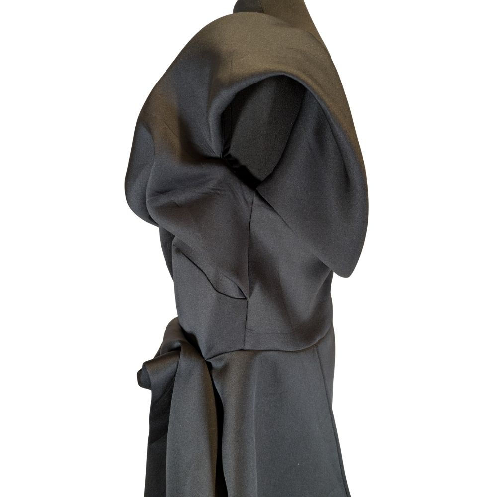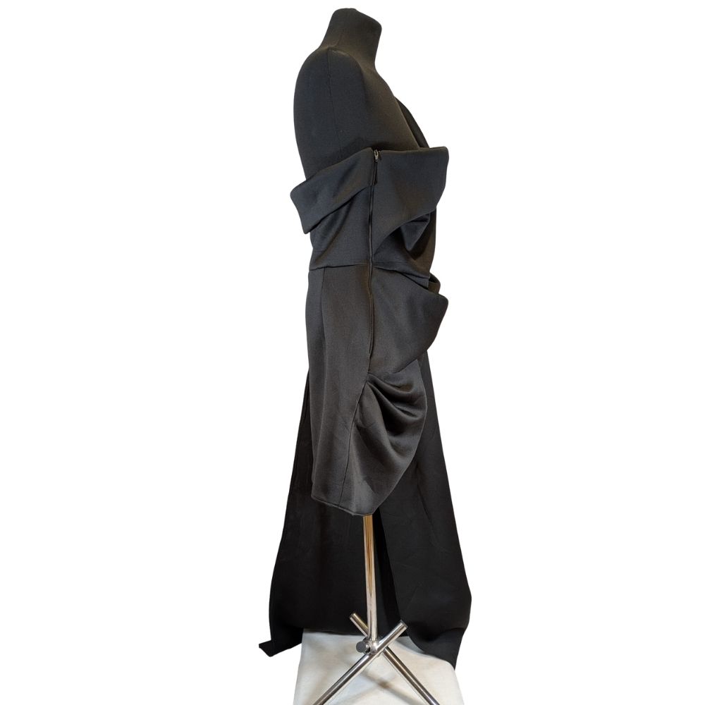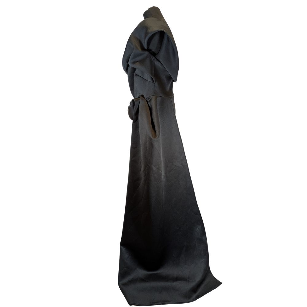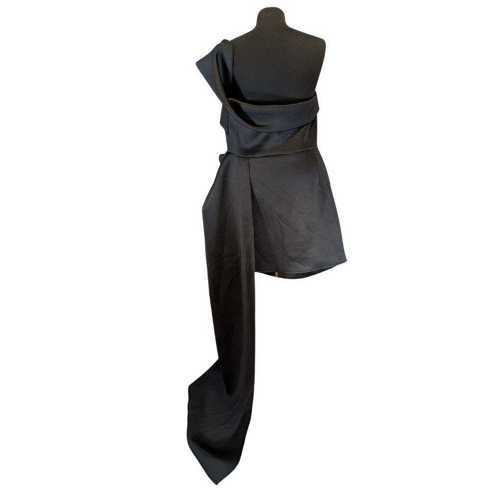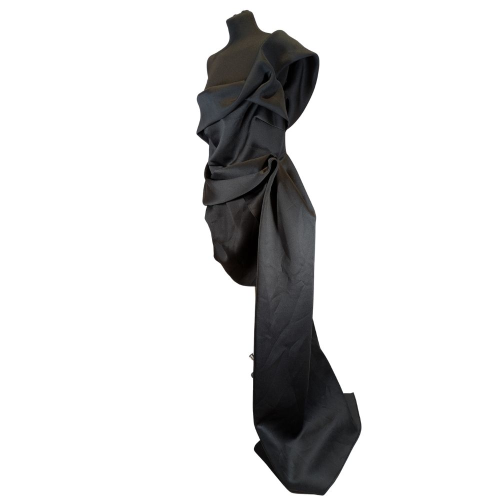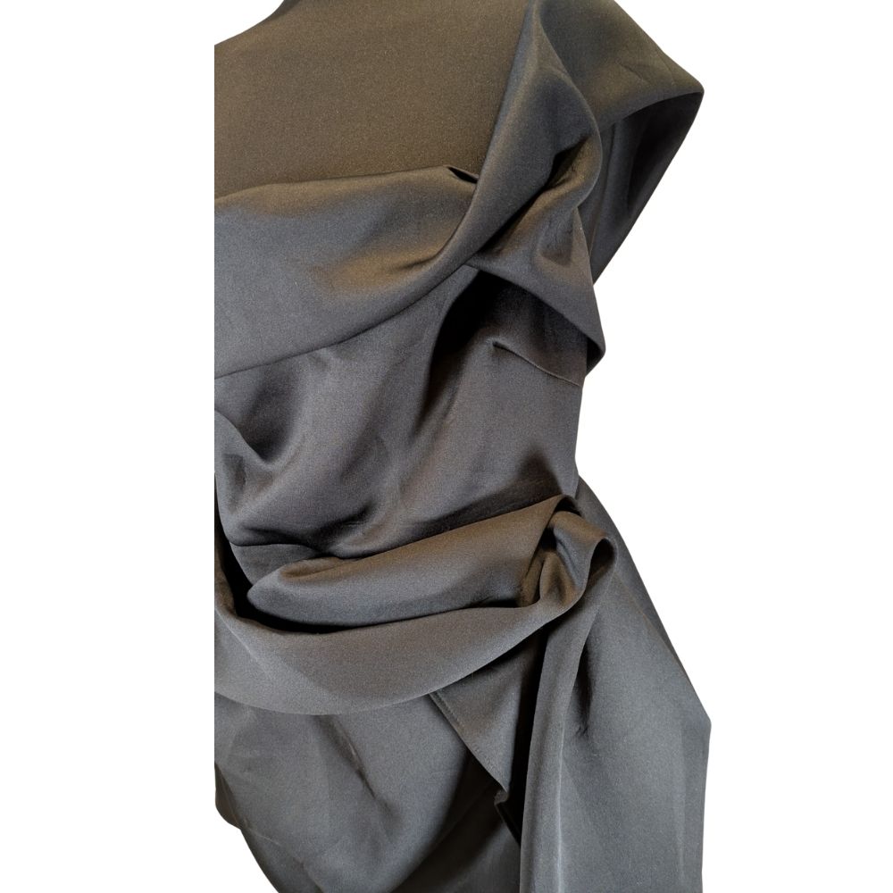 Sukienka zachwyca przemyślaną, architektoniczną formą, która redefiniuje pojęcie wieczorowej małej czarnej. Asymetryczna góra z misternym drapowaniem gorsetu miękko otula sylwetkę, nadając całości szlachetnego i zmysłowego charakteru. Strategicznie rozmieszczone marszczenia na boku talii nie tylko dodają nowoczesnego sznytu, ale również perfekcyjnie modelują figurę, podkreślając atuty sylwetki w rozmiarze 46.