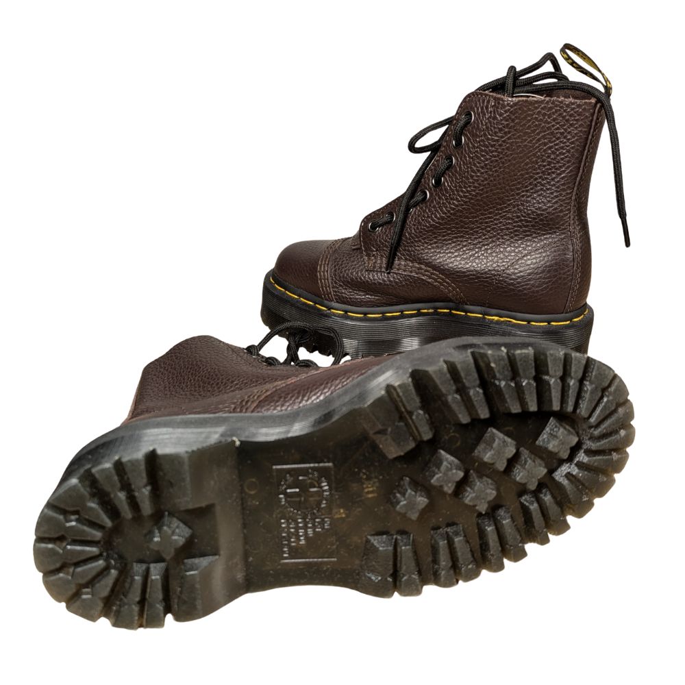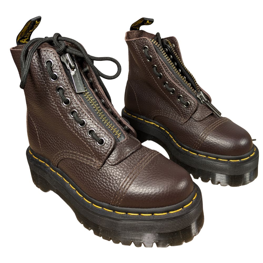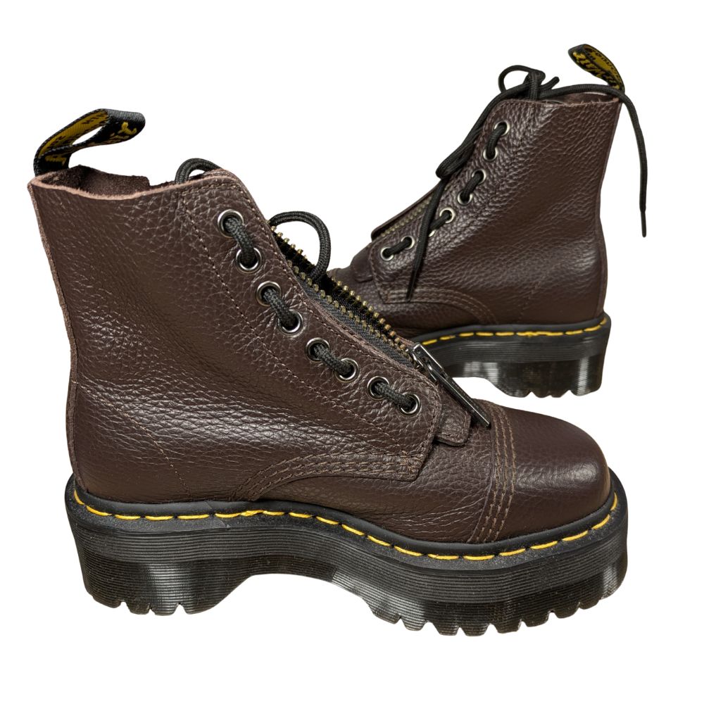 Botki Dr. Martens Sinclair to połączenie militarnego sznytu z bezkompromisową wygodą. Ich monumentalna platforma Quad dodaje pewności siebie, a głęboki brąz skóry nadaje im ponadczasowej szlachetności.
