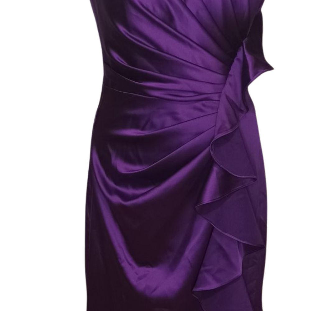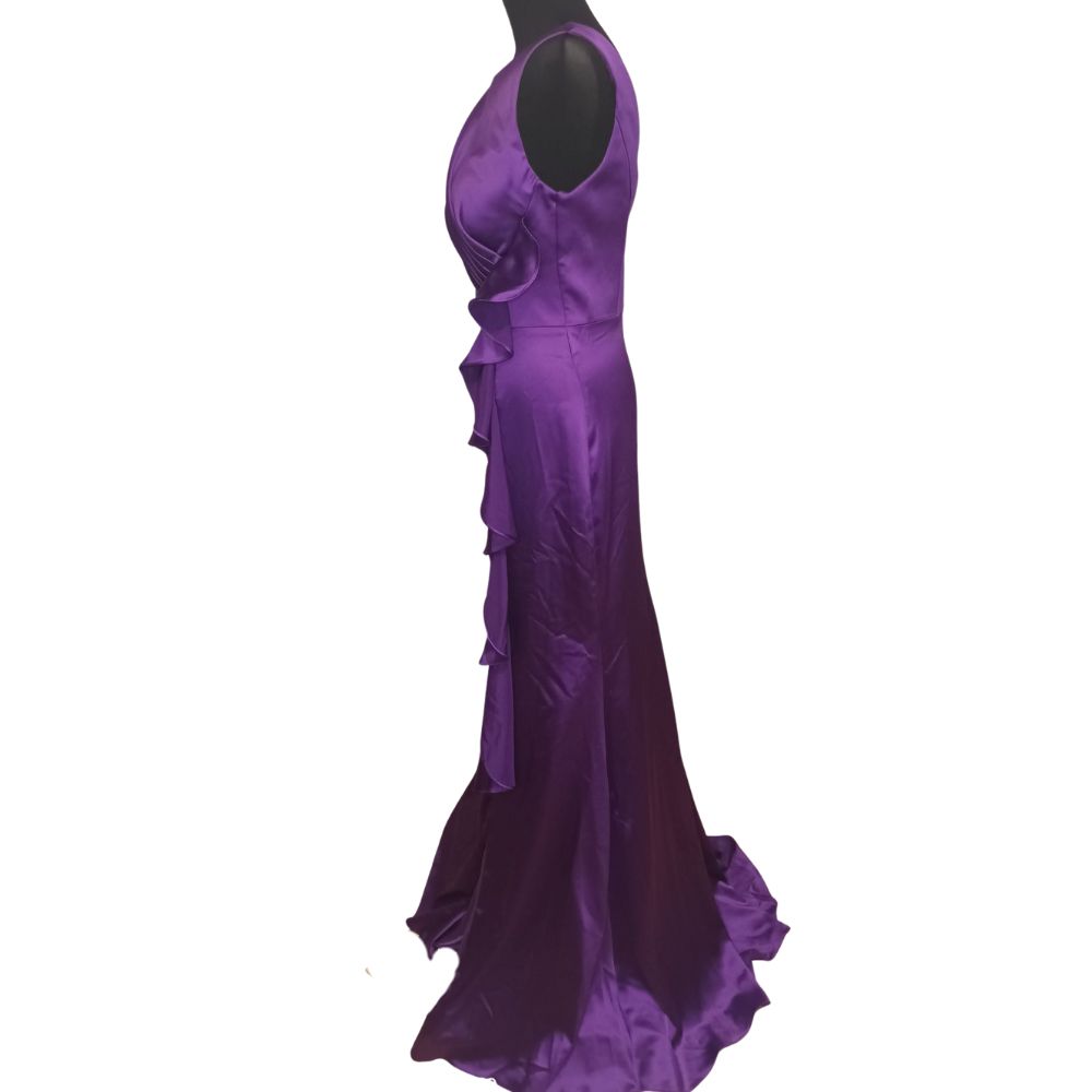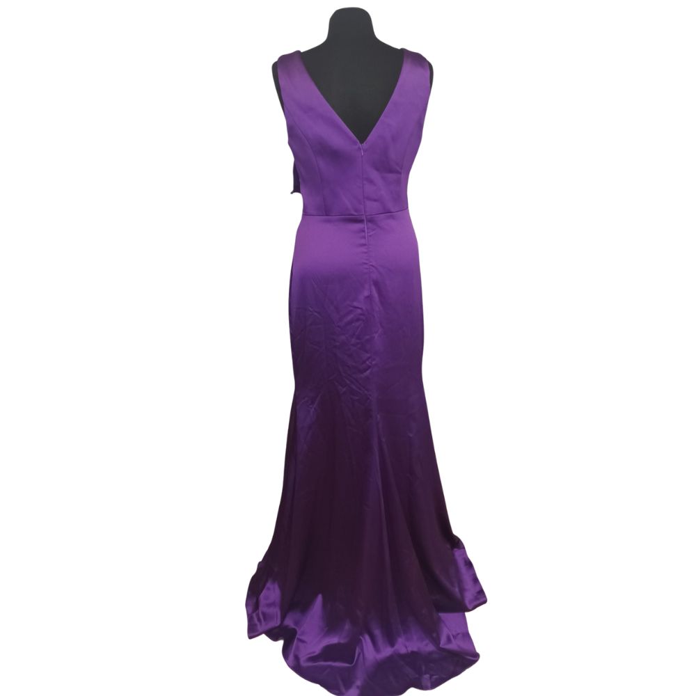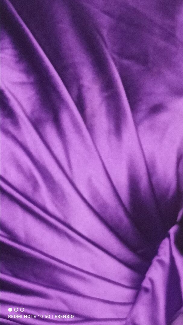 Prezentowany model w nasyconym kolorze Ametystu (Mor) zachwyca szlachetnym wykończeniem i przemyślaną konstrukcją. Najbardziej charakterystycznym elementem sukni jest mistrzowskie, poprzeczne drapowanie w talii, z którego wyłania się długa, pionowa falbana, nadając sylwetce dynamicznego, posągowego charakteru.