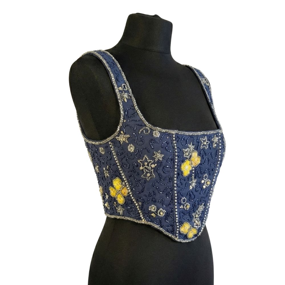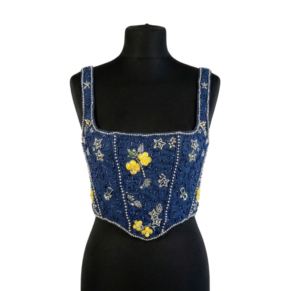 Top od ASOS DESIGN to małe dzieło sztuki krawieckiej. Głębia granatu spotyka się tu z misternym haftem koralikowym, tworząc kreację, która nie potrzebuje dodatkowej biżuterii, by olśniewać.