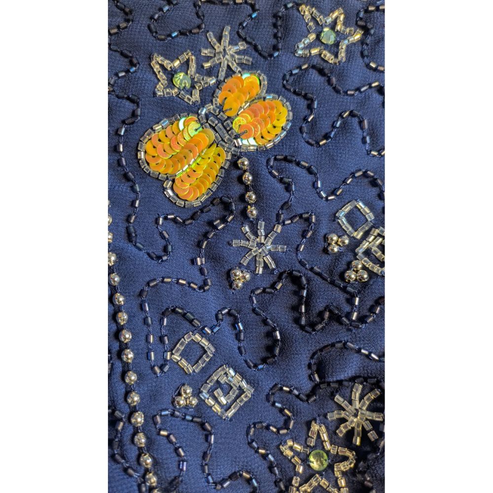 Model ten zachwyca bogactwem zdobień. Cała powierzchnia topu została pokryta drobnymi, błyszczącymi koralikami, które układają się w geometryczne i roślinne motywy. Krótki fason typu cropped o wysokości 40 cm idealnie komponuje się ze spodniami lub spódnicami z wysokim stanem.
