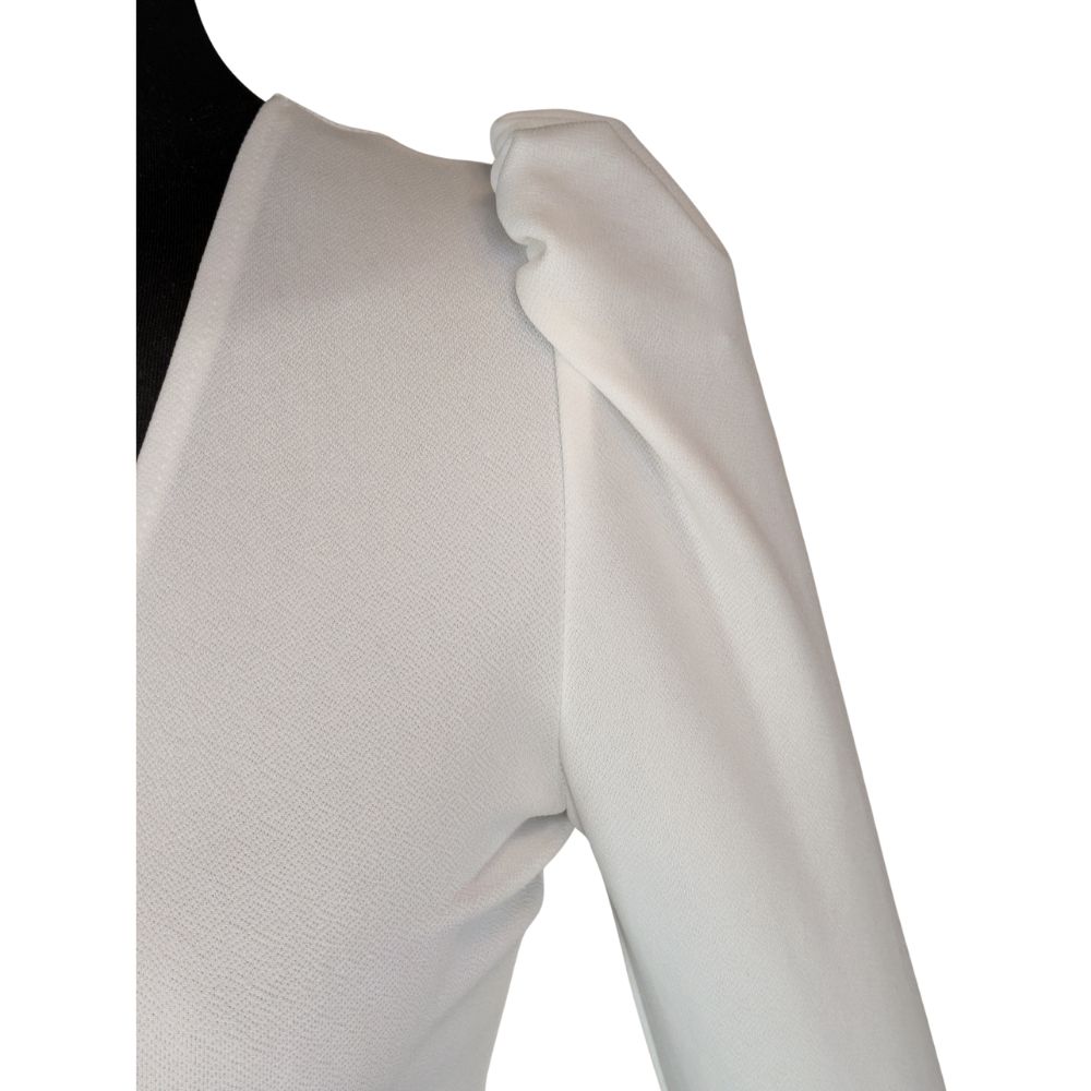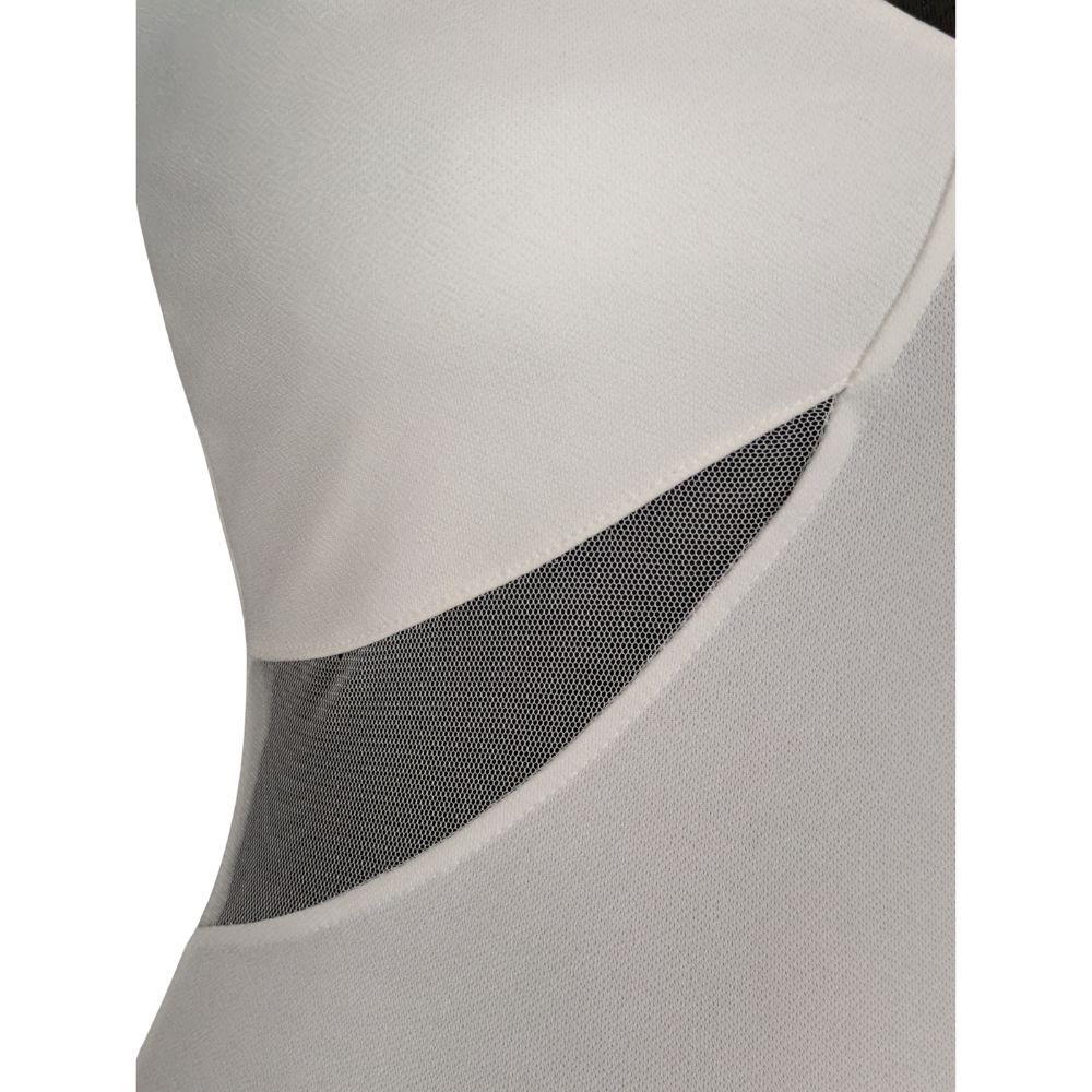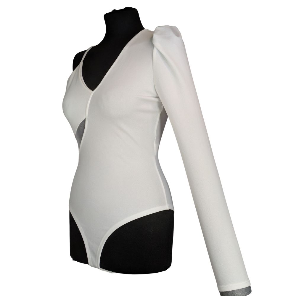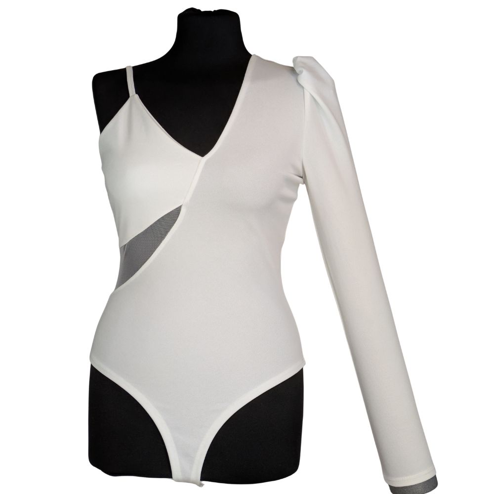 Głównym atutem tego modelu jest asymetryczny dekolt typu V. Z jednej strony subtelnie eksponuje ramię za pomocą cienkiego, regulowanego ramiączka, z drugiej – przyciąga wzrok długim, dopasowanym rękawem z wyraźnie zaznaczoną bufką (tzw. rękaw księżniczki). Uwagę przykuwa również intrygujące, trójkątne wycięcie cut out na linii talii, wypełnione drobną, czarną siateczką.