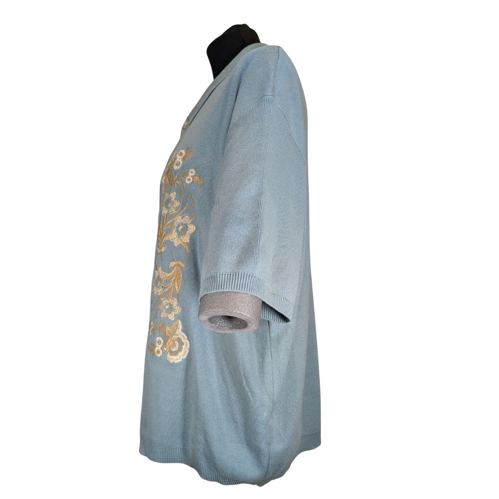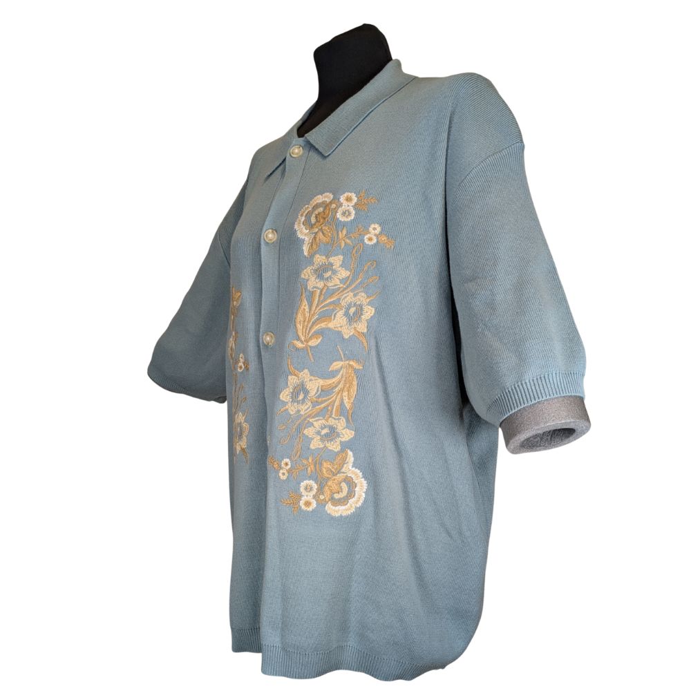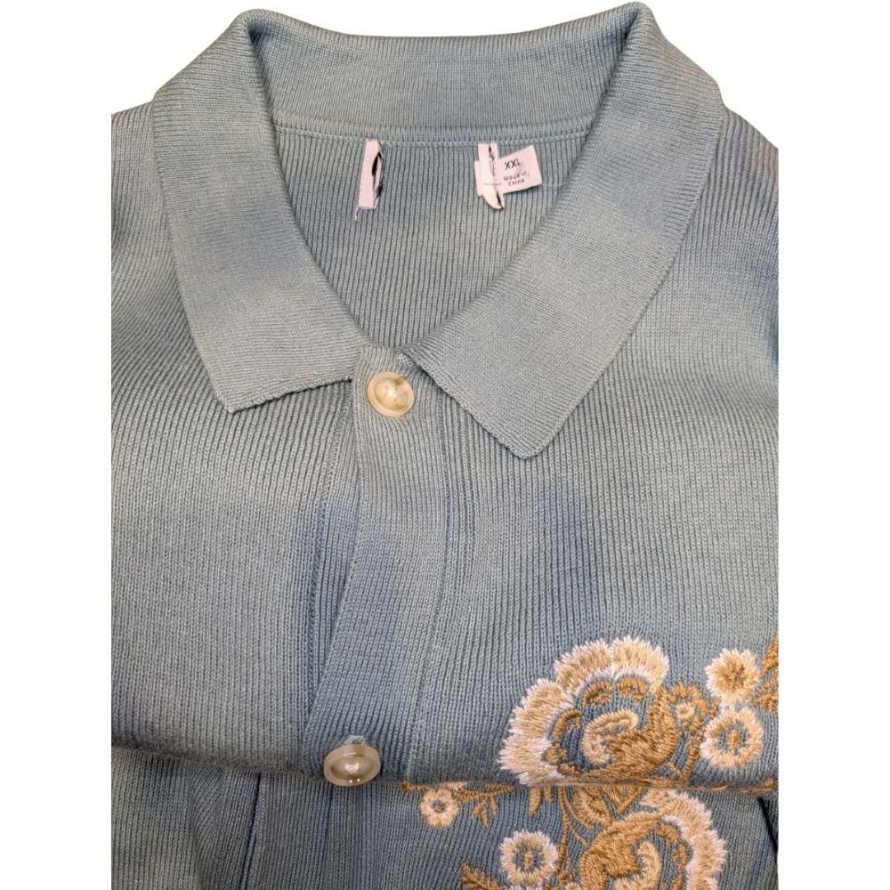 Ten model to mistrzowskie połączenie formy i faktury. Posiada krój typowy dla koszulki polo – z charakterystycznym kołnierzykiem i zapięciem na jasne guziki, jednak został wykonany ze średniej grubości, miękko układającej się dzianiny (swetra). Największą uwagę przyciąga duży, symetryczny haft z motywem florystycznym w stonowanych odcieniach beżu i bieli, który pięknie odznacza się na tle gołębiego błękitu.