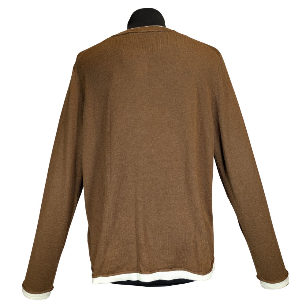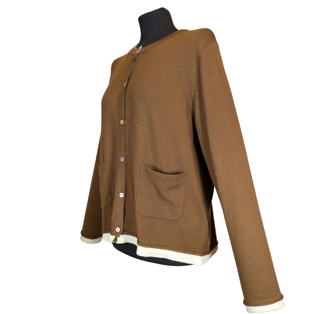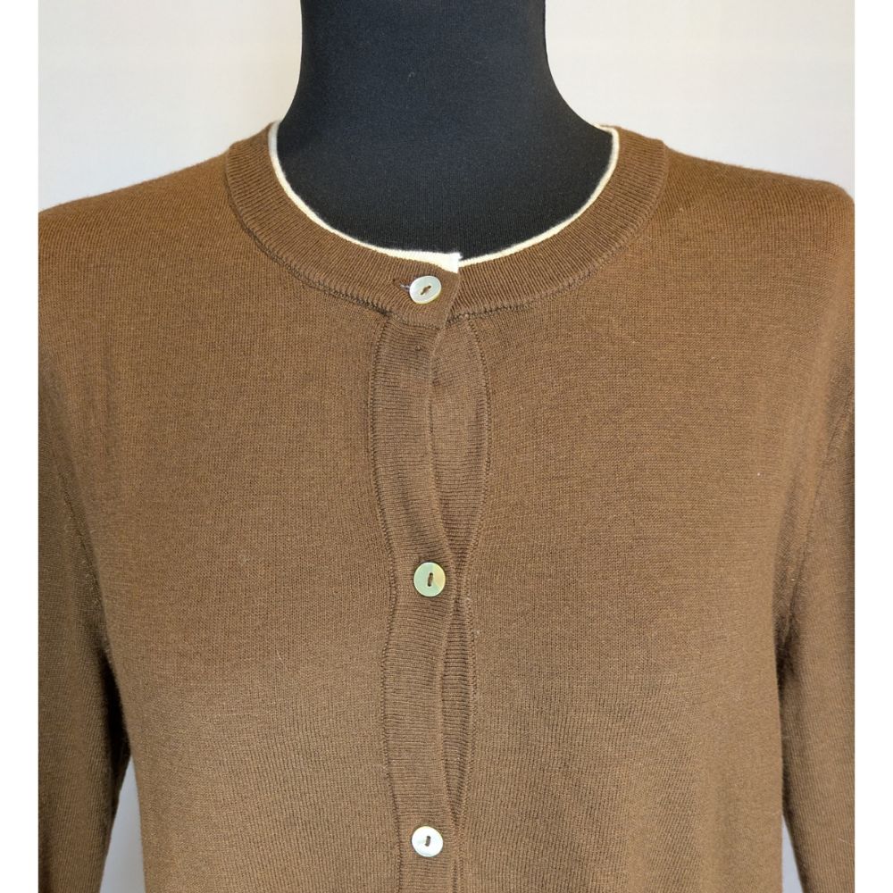Fason tego swetra nawiązuje do klasycznego stylu preppy. Posiada gładki, półokrągły dekolt i jednorzędowe zapięcie na guziki, które imitują jasną masę perłową, dodając całości eleganckiego połysku. Ciekawym akcentem są kontrastujące, białe krawędzie (lamówki), które pojawiają się wokół szyi, na dole swetra oraz przy wykończeniu rękawów.