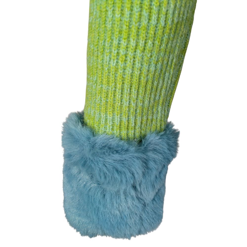 Główną gwiazdą tego modelu są obszerne wstawki ze sztucznego futerka w mocno kontrastującym, błękitnym odcieniu. Zdobienia te znajdują się na szerokim kołnierzu oraz mankietach. Co ważne – zgodnie z informacją na metce – futerko jest odpinane (przypięte na małe, ukryte guziczki), co ułatwia pranie i pozwala na zmianę charakteru swetra na bardziej klasyczny.
