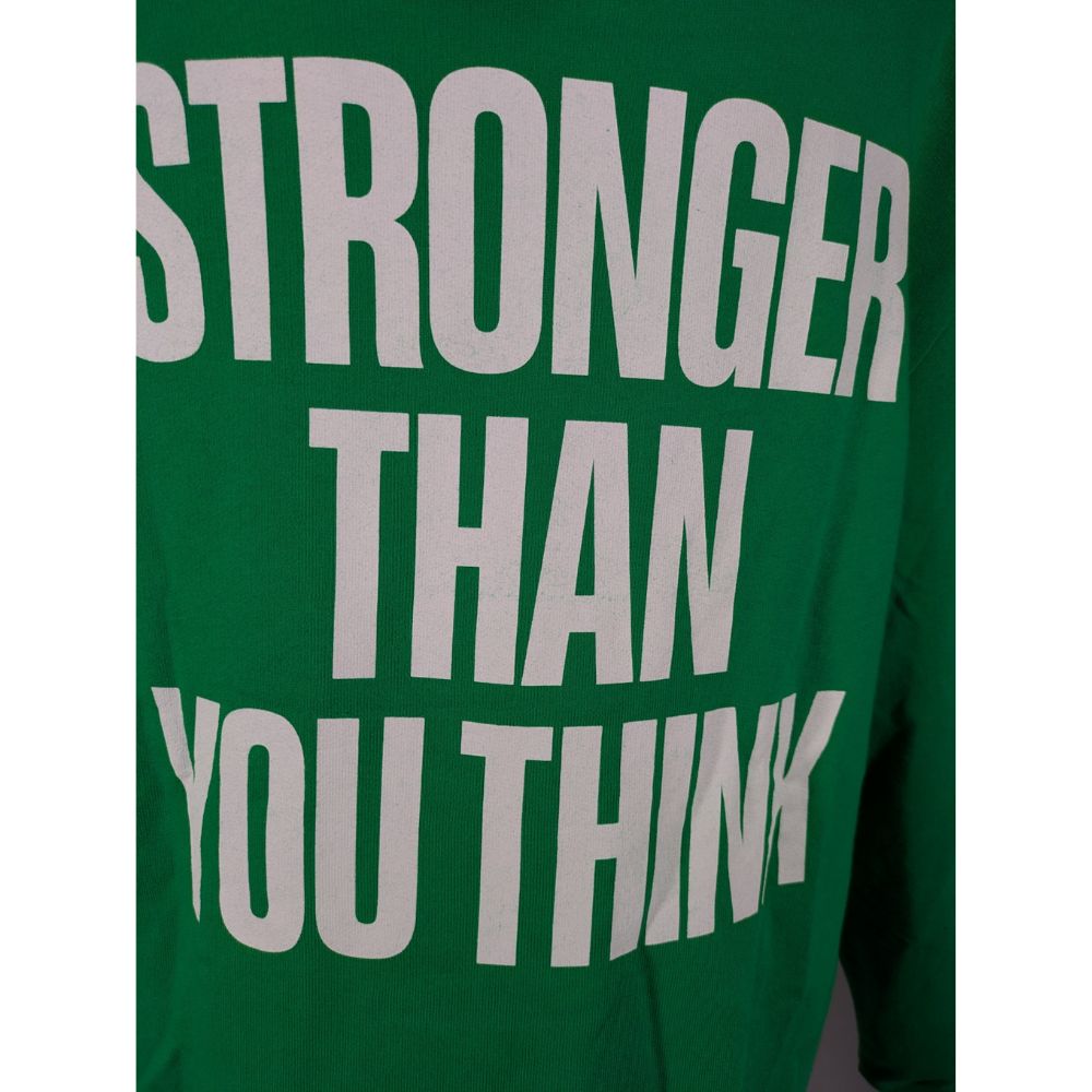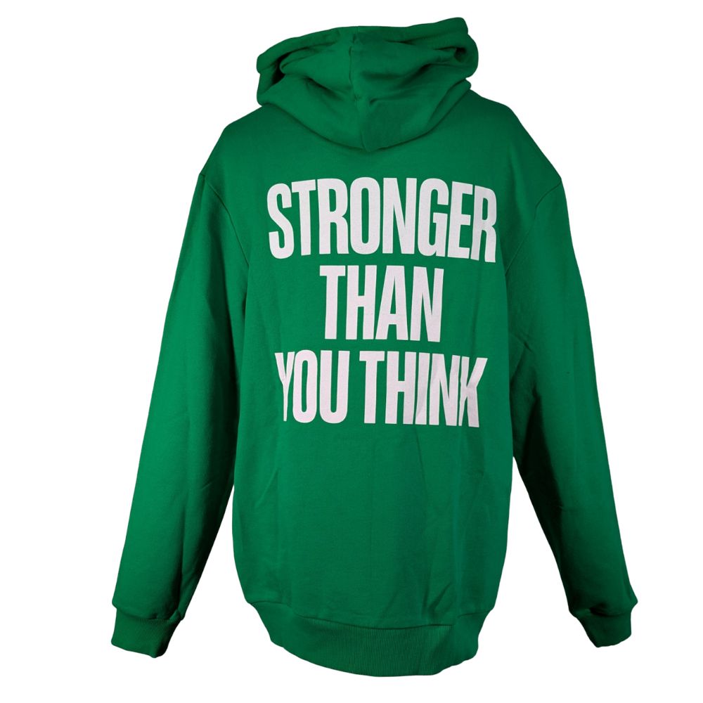 Fason tego modelu to klasyczna, rozpinana bluza dresowa (zip-up hoodie). Została uszyta z gładkiej, przyjemnej w dotyku dzianiny w głębokim, zielonym kolorze. Na lewej piersi wyeksponowano białe, kultowe koła olimpijskie, natomiast tył zdobi duży, motywacyjny nadruk "STRONGER THAN YOU THINK", który dodaje bluzie wyrazistego charakteru.