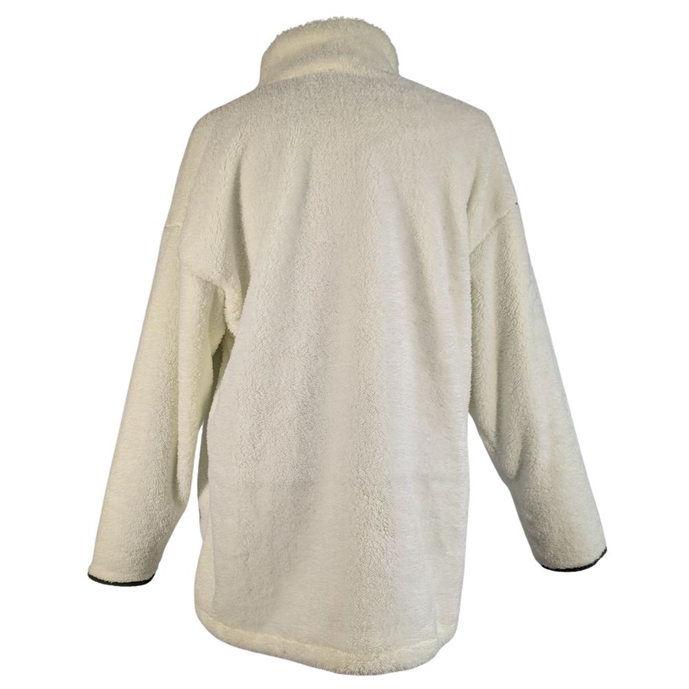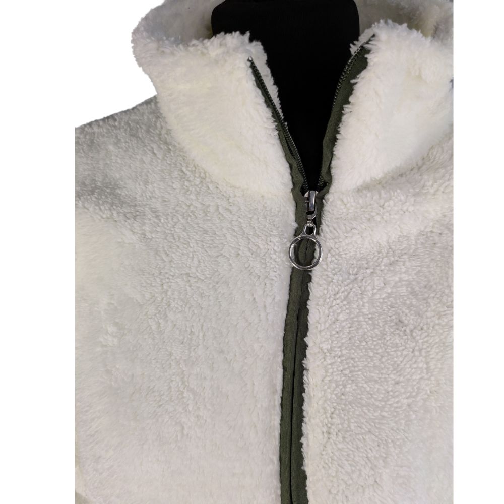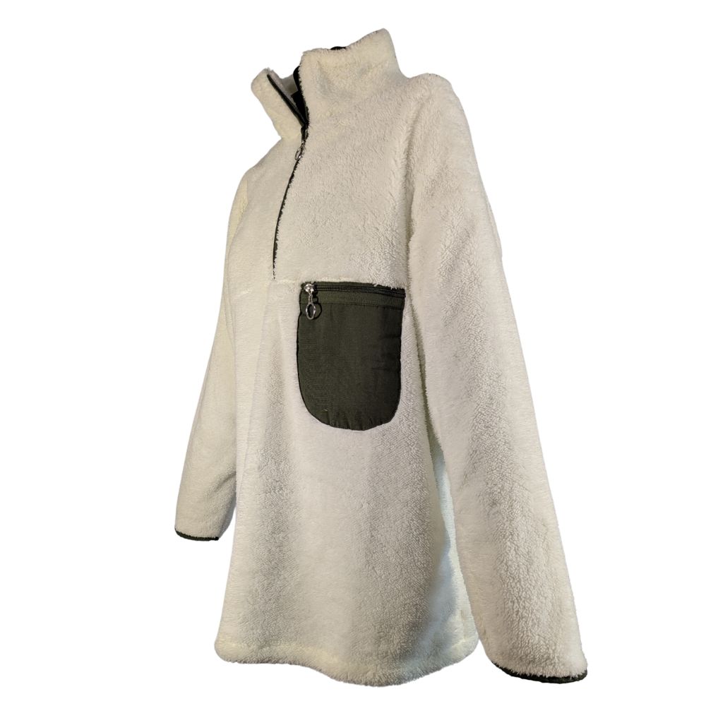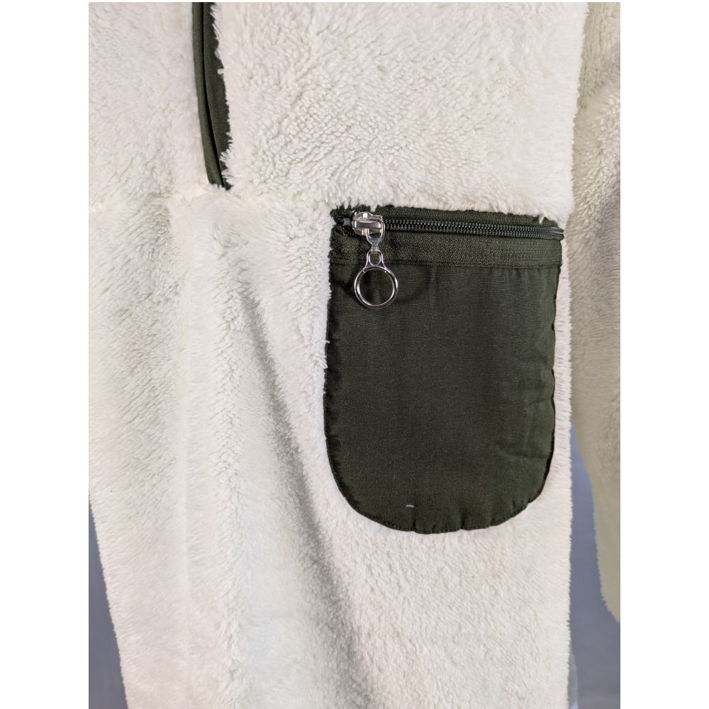 Bluza zachwyca miękkim, sztucznym futerkiem typu sherpa (100% poliester), które doskonale izoluje ciepło. Jasny, śmietankowy odcień (Ecru) urozmaicono wstawkami w głębokim, oliwkowym kolorze – widocznymi przy zamku, na oblamówkach oraz w postaci funkcjonalnej, zapinanej kieszonki na lewej piersi.