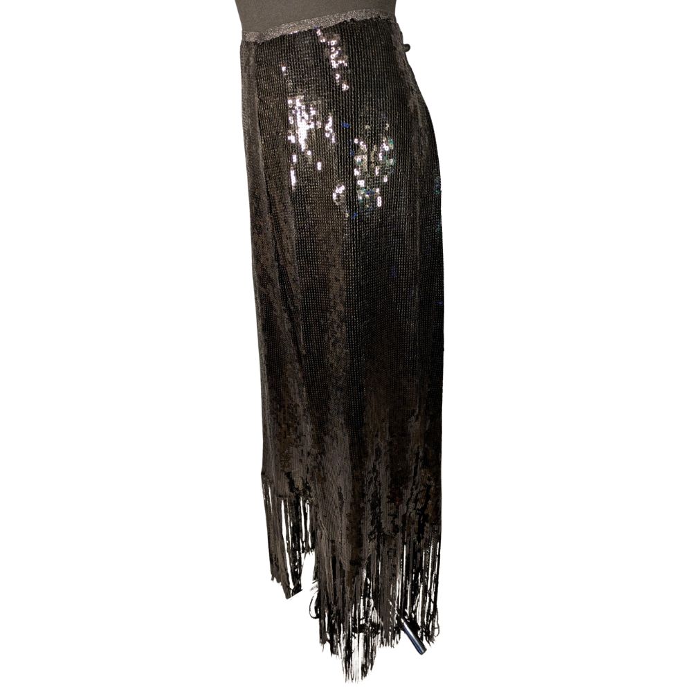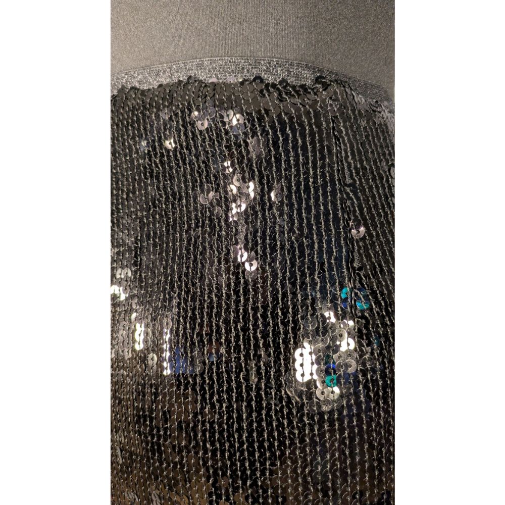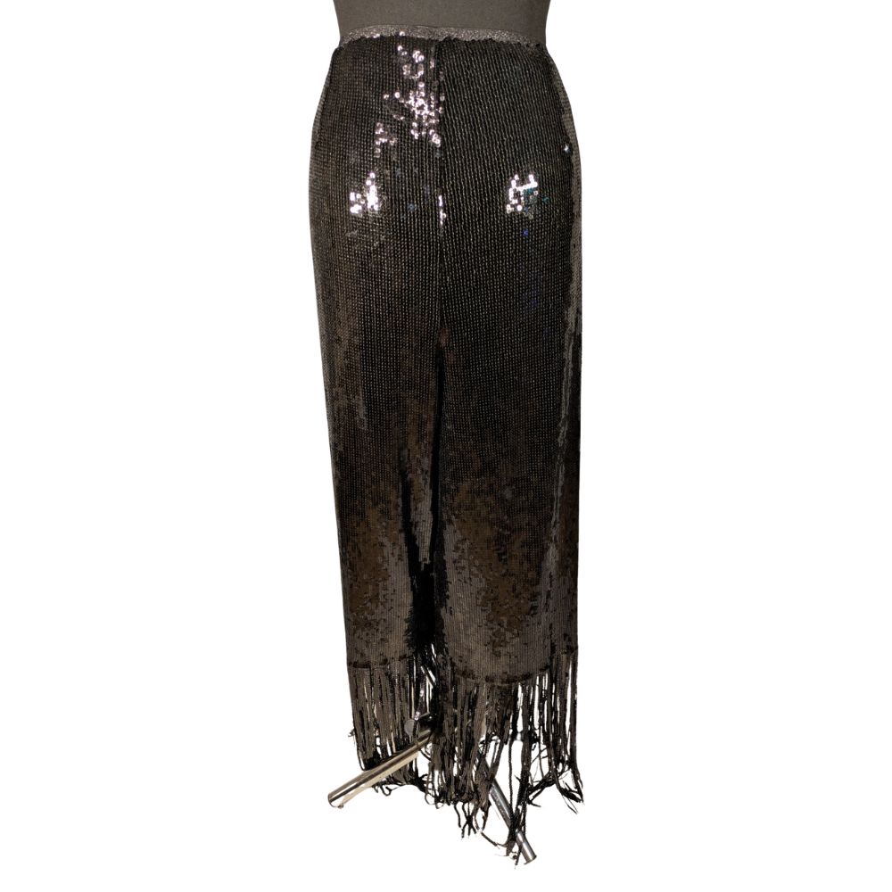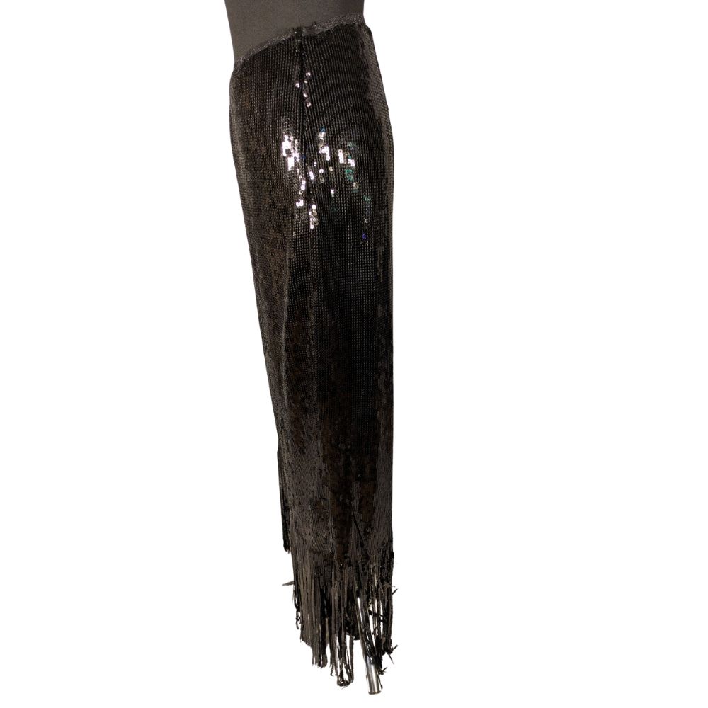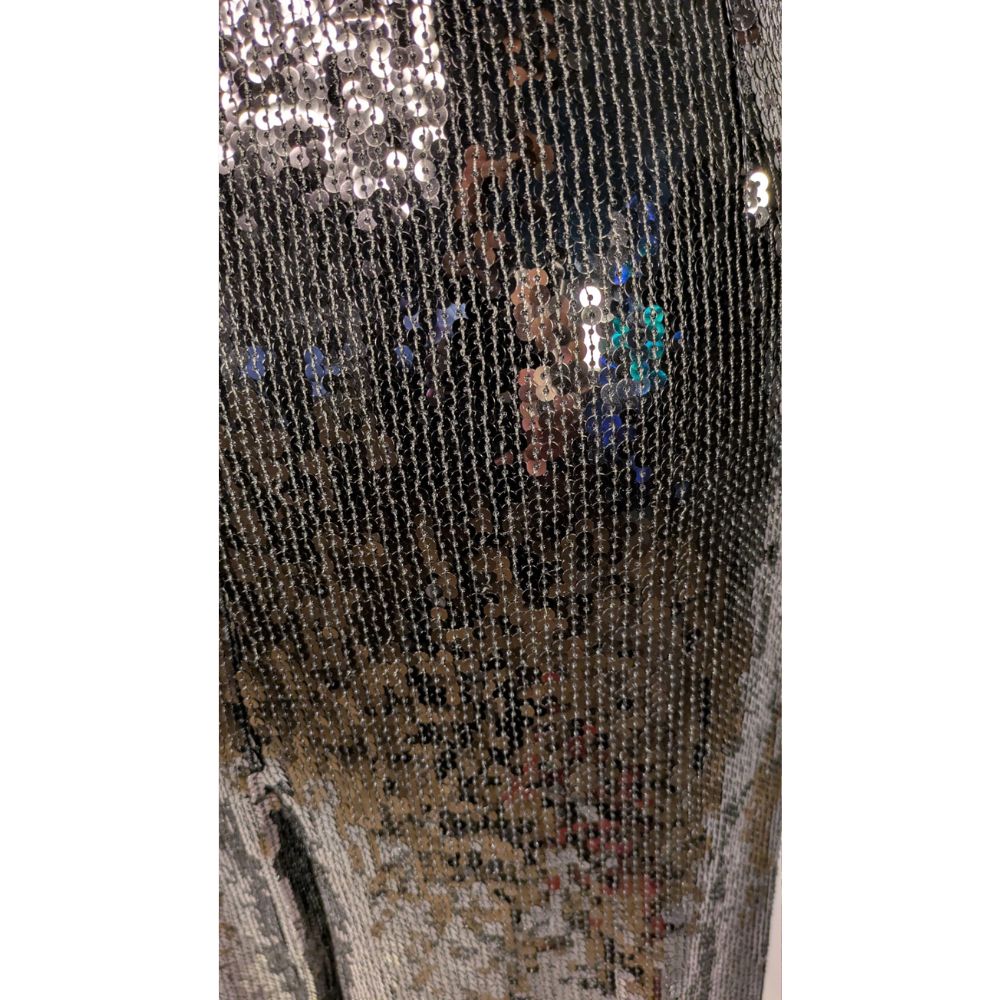 Głównym atutem tych spodni jest ich widowiskowy materiał zewnętrzny (shell), który w całości pokryto gęsto przyszytymi, drobnymi cekinami, wspaniale odbijającymi światło. Szerokie, swobodnie opadające nogawki zostały wykończone na dole długimi, asymetrycznymi frędzlami (również cekinowymi), które fantastycznie pracują podczas każdego kroku i w tańcu.