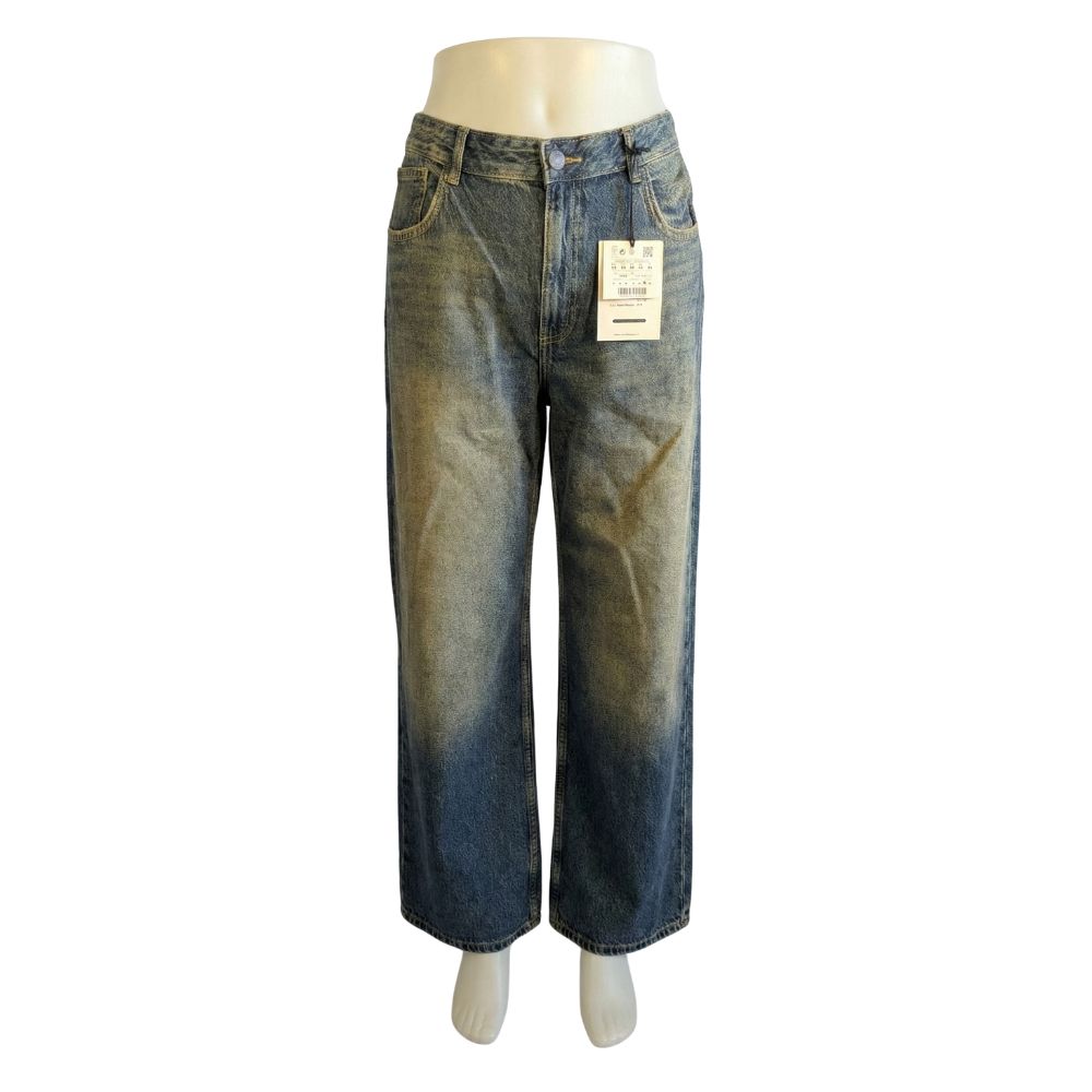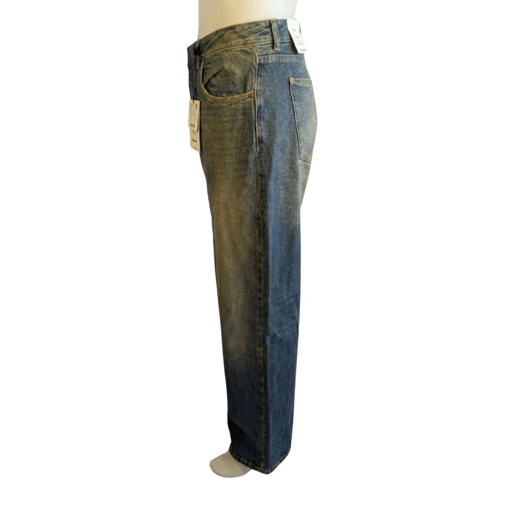 Uwagę zwraca proces wykończenia materiału. Klasyczny, niebieski denim został poddany intensywnej obróbce i dekatyzacji (tzw. "dirty wash"), uzyskując pożądany, postarzany wygląd z wyraźnymi, żółto-piaskowymi przejściami tonalnymi na przodzie i tyle. Skład to 100% grubszego, klasycznego denimu bawełnianego.