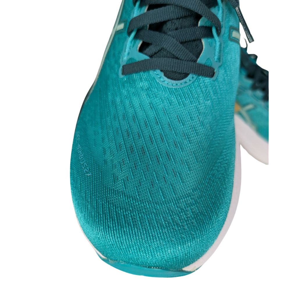 Cholewka wykonana z zaawansowanej, inżynieryjnie tkanej siateczki otula stopę niczym druga skarpeta, zapewniając wyjątkową przewiewność i wsparcie w kluczowych miejscach. Turkusowo-morski odcień z granatowymi detalami nadaje butom nowoczesnego, dynamicznego charakteru. Całość wieńczy podeszwa zewnętrzna wzmocniona trudnościeralną gumą AHAR+.