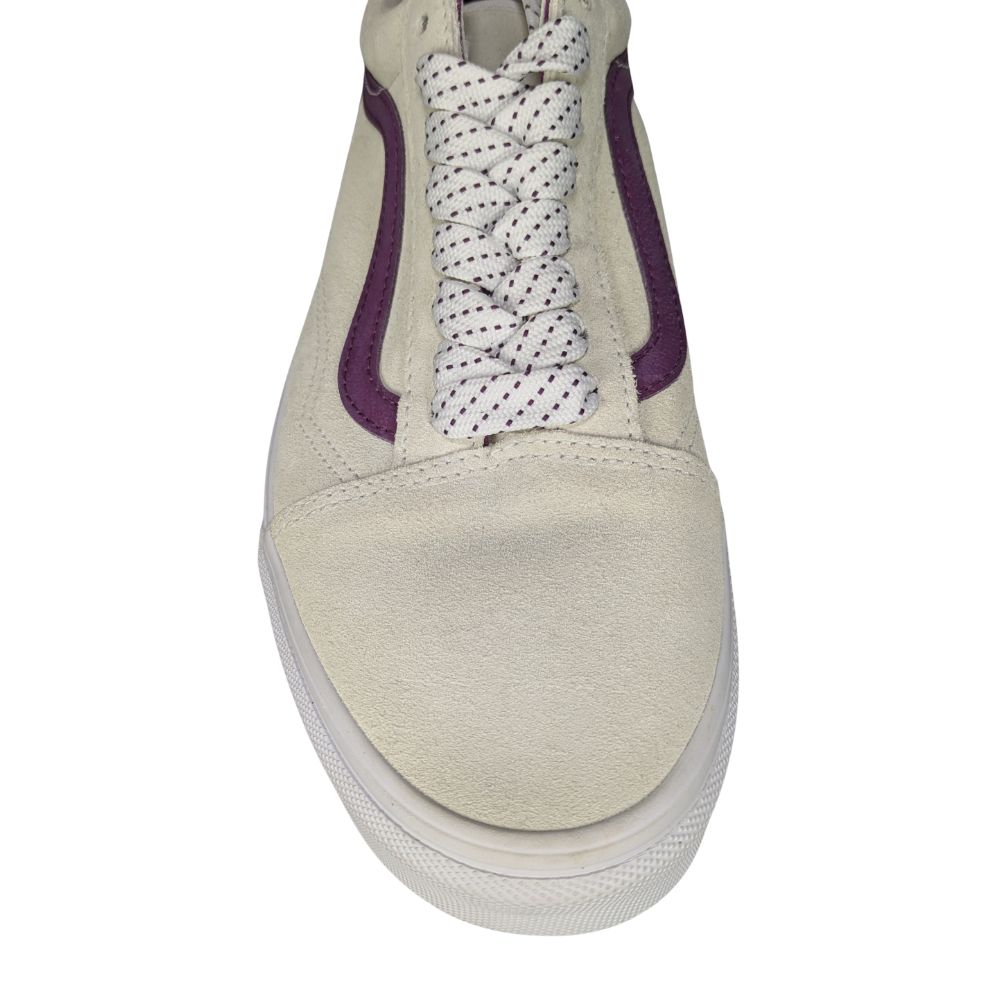 Buty osadzono na klasycznej, wulkanizowanej podeszwie z kultowym, "waflowym" bieżnikiem marki Vans. Taka konstrukcja gwarantuje wyjątkową elastyczność i trakcję, niezbędną nie tylko na desce, ale i na śliskich, miejskich chodnikach. Całość wieńczy charakterystyczne logo z tyłu podeszwy.