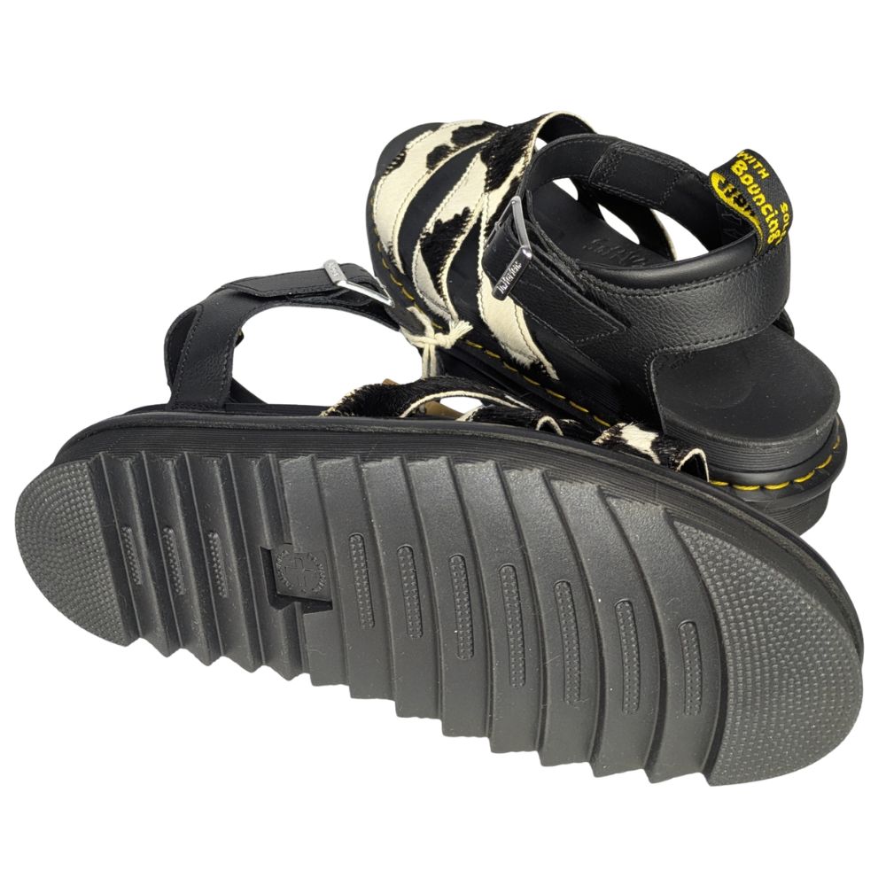 Zabierz ze sobą DNA marki Dr. Martens w najcieplejsze dni roku. Model Blaire na platformie łączy ikoniczną trwałość i kultową żółtą nić z bezkompromisowym, przyciągającym spojrzenia motywem w krowie łaty.