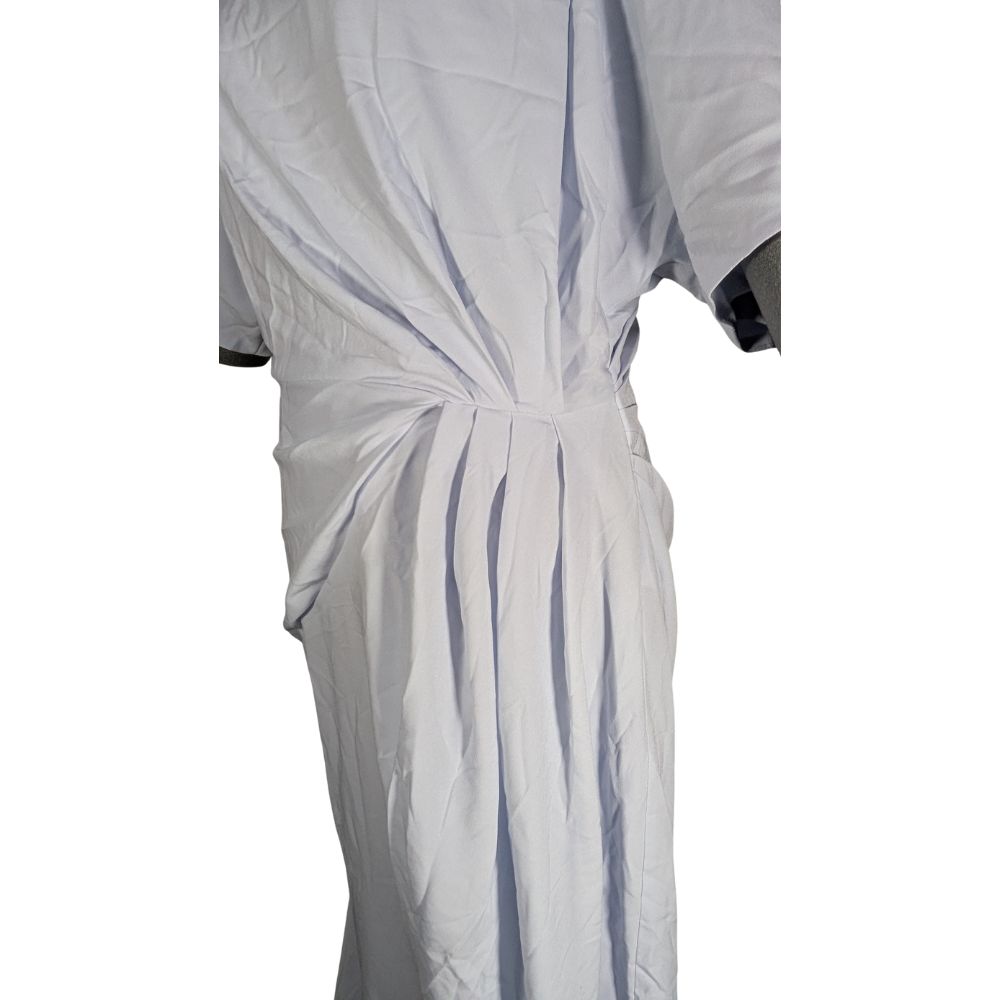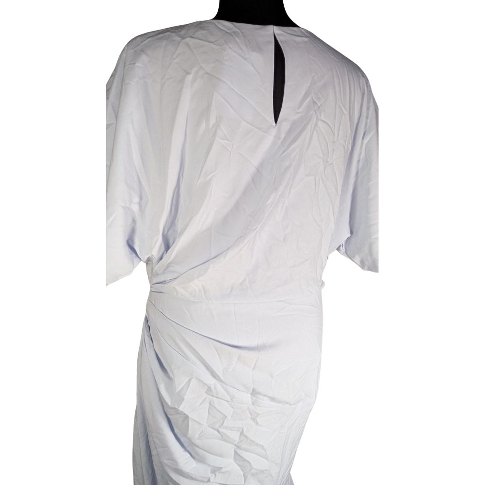 Góra sukienki z wysokim dekoltem i krótkimi, szerokimi rękawami (36 cm) równoważy wysokie rozcięcie na dole, które eksponuje nogę w ruchu. Całość wykonana z gładkiej tkaniny poliestrowej, zapinanej z tyłu na dyskretny zamek.