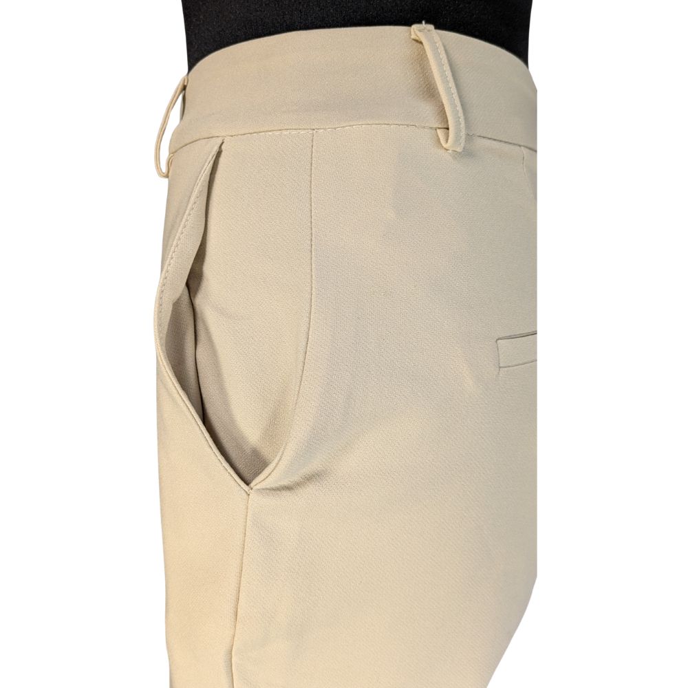Sekret wygody tkwi w zaawansowanym składzie materiału – dodatek aż 12% elastanu sprawia, że tkanina jest wyjątkowo sprężysta i wraca do pierwotnego kształtu, zapobiegając wypychaniu się kolan. Subtelny odcień "Stone" (kamienny beż) stanowi doskonałą bazę do stylizacji z klasyczną koszulą lub luźnym swetrem.