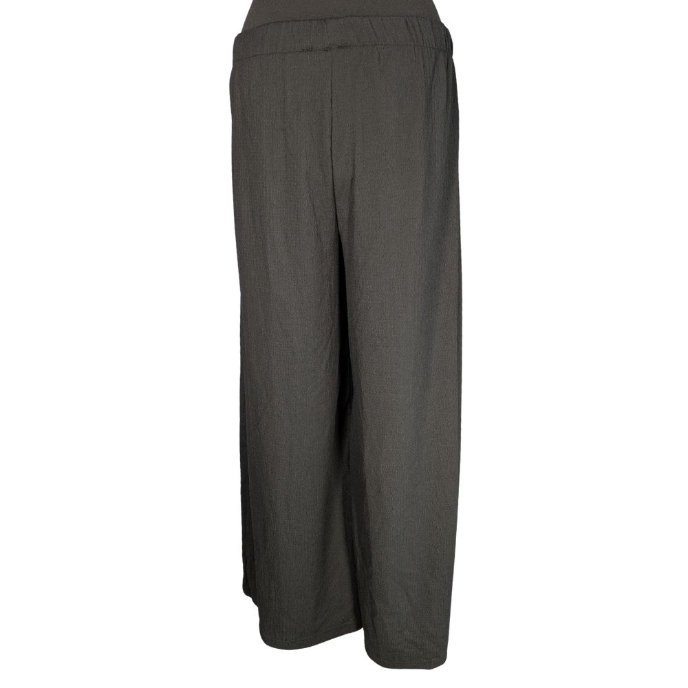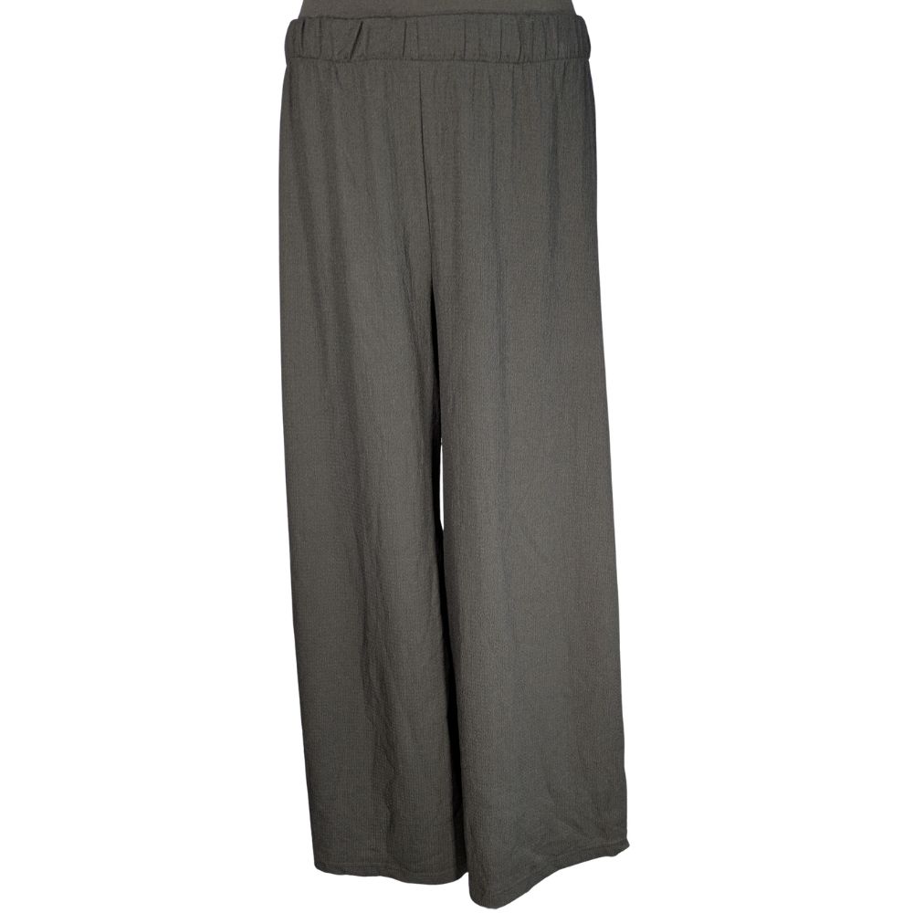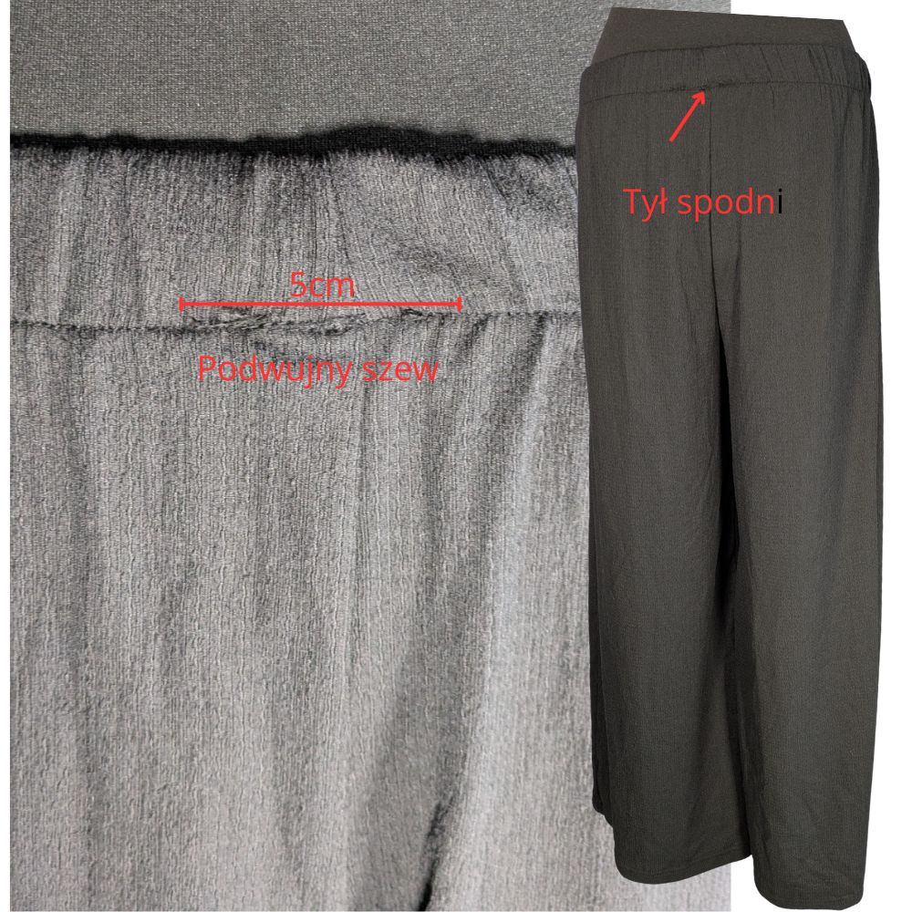 Sercem tego modelu jest komfortowy stan wykończony elastyczną gumką (30 cm bez rozciągania), która miękko i stabilnie dopasowuje się do talii. Bardzo szerokie nogawki, o wymiarze aż 36 cm na dole, efektownie układają się podczas ruchu. Dzięki zastosowaniu lejącej tkaniny z dodatkiem elastanu (95% poliester, 5% elastan), materiał jest sprężysty i bardzo dobrze współpracuje z sylwetką.