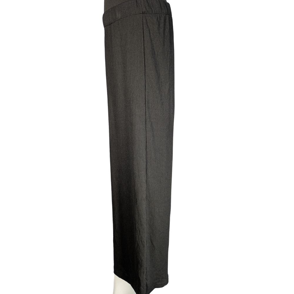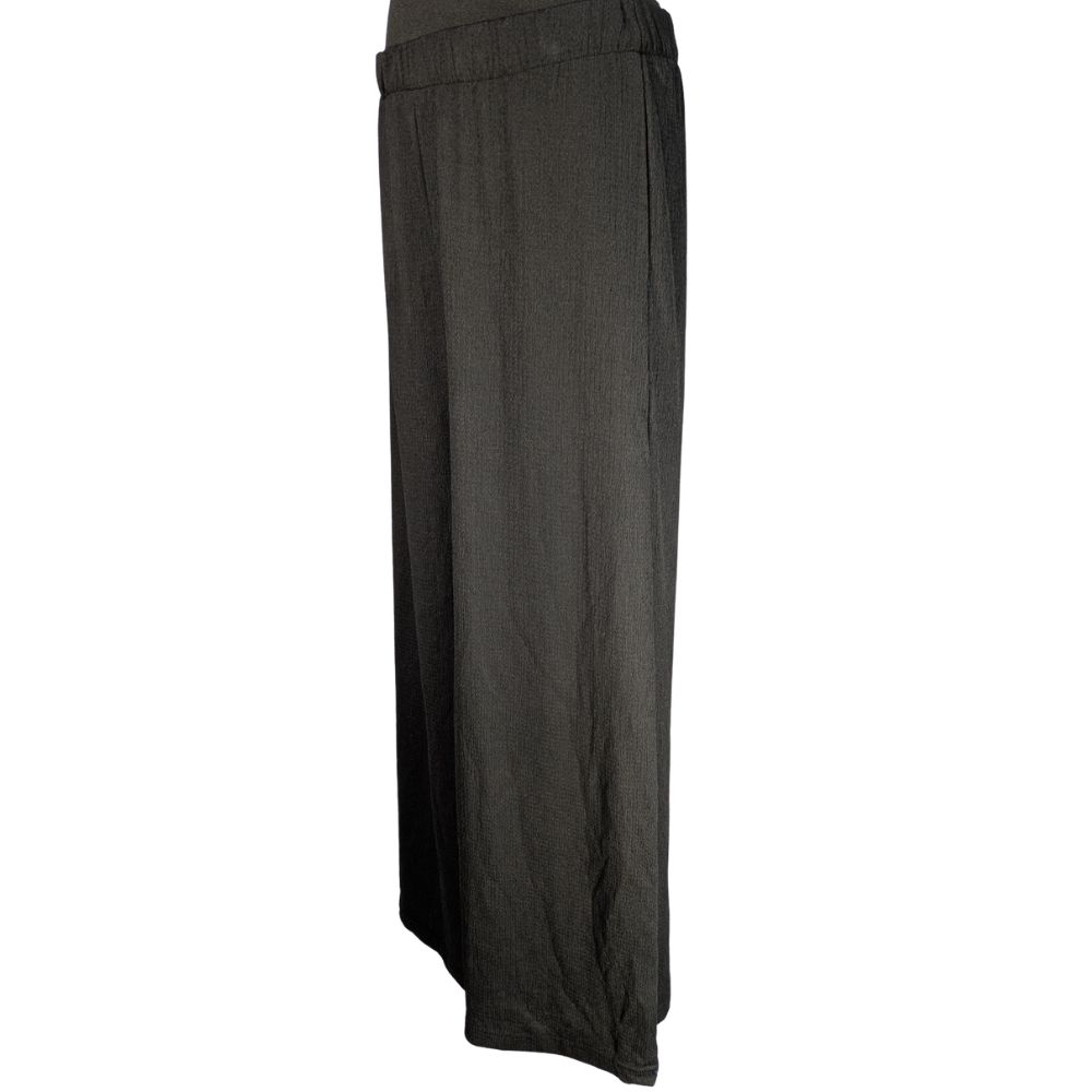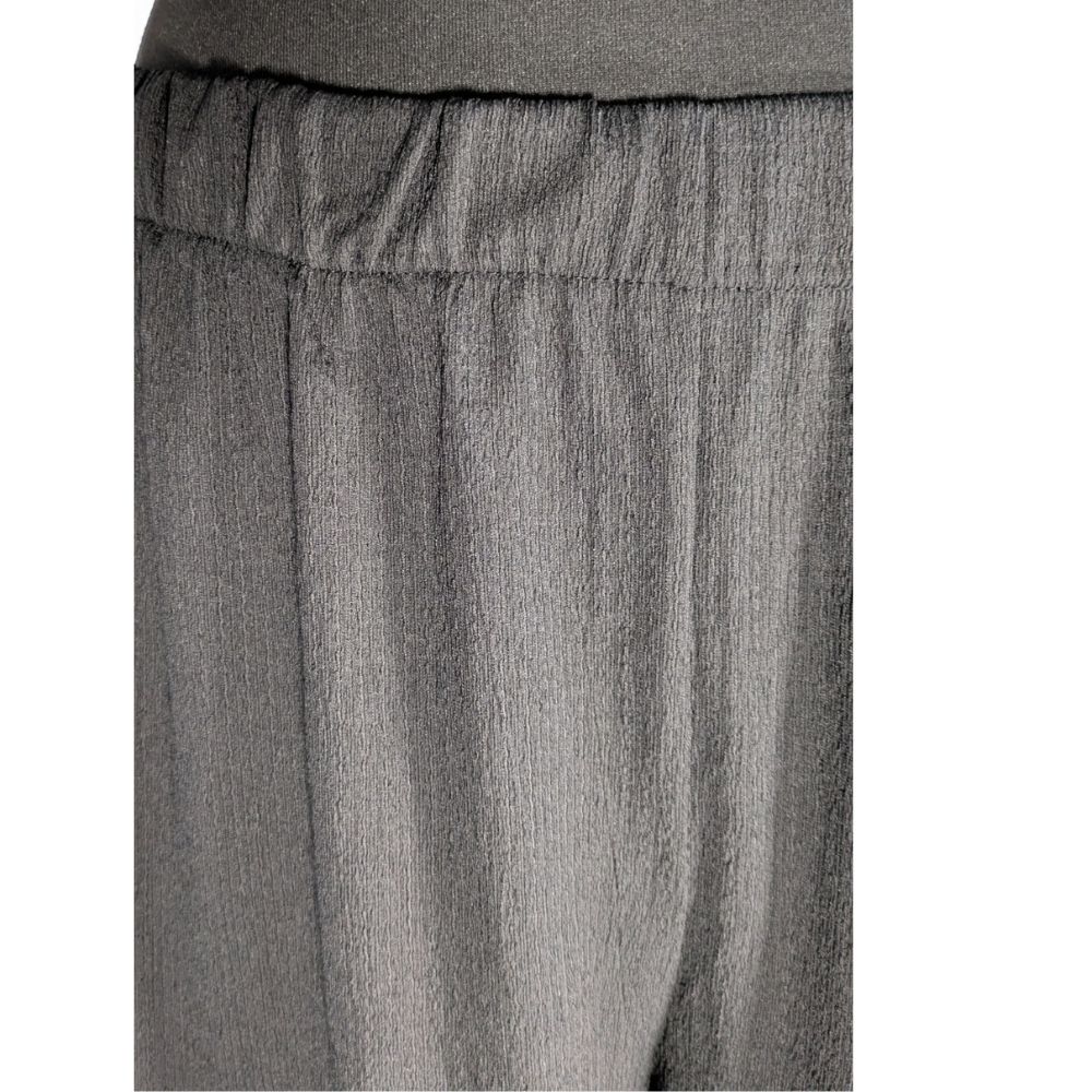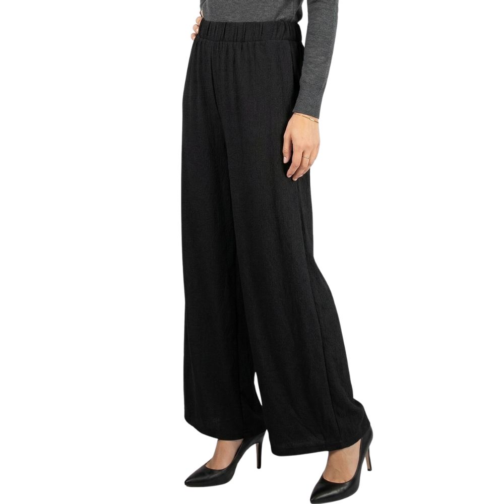 Sercem tego modelu jest komfortowy stan wykończony elastyczną gumką (30 cm bez rozciągania), która miękko i stabilnie dopasowuje się do talii. Bardzo szerokie nogawki, o wymiarze aż 36 cm na dole, efektownie układają się podczas ruchu. Dzięki zastosowaniu lejącej tkaniny z dodatkiem elastanu (95% poliester, 5% elastan), materiał jest sprężysty i bardzo dobrze współpracuje z sylwetką.