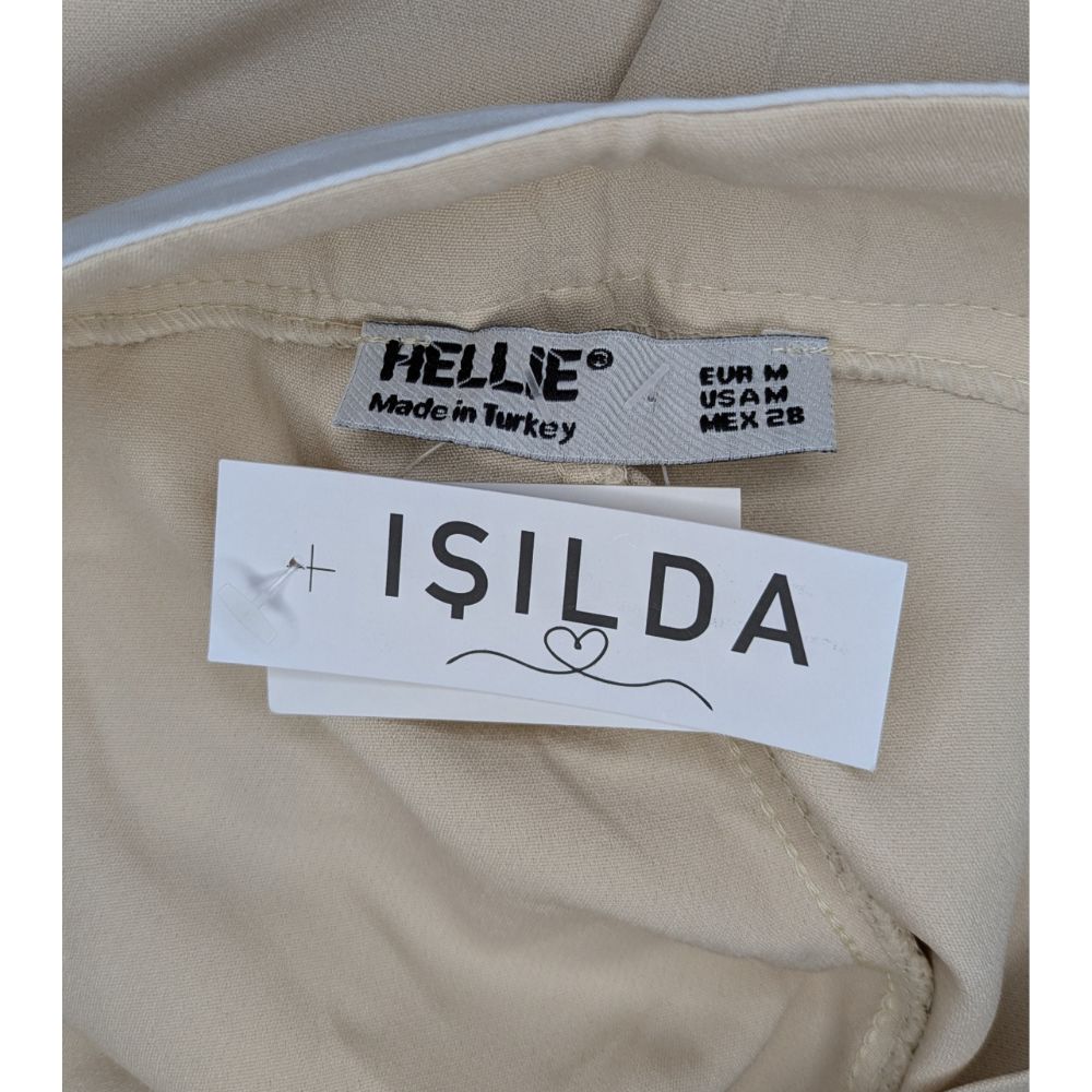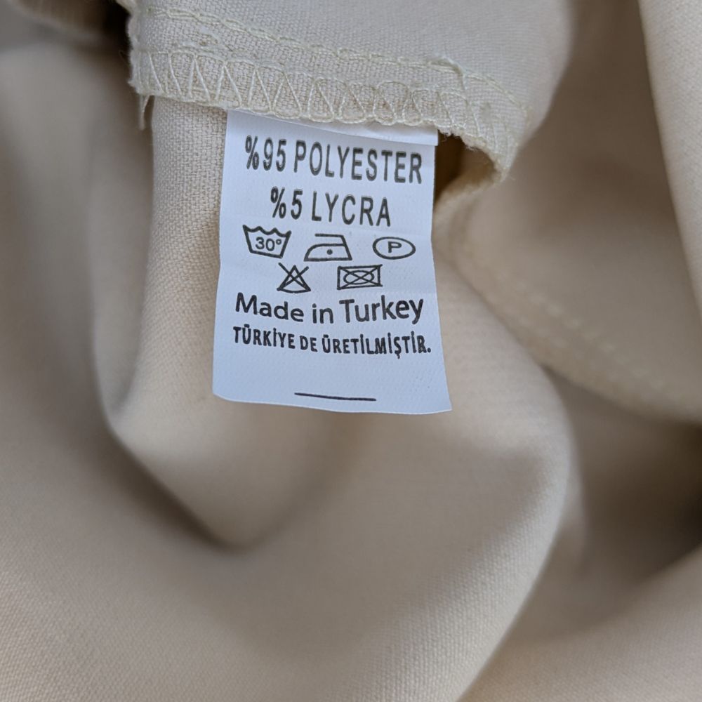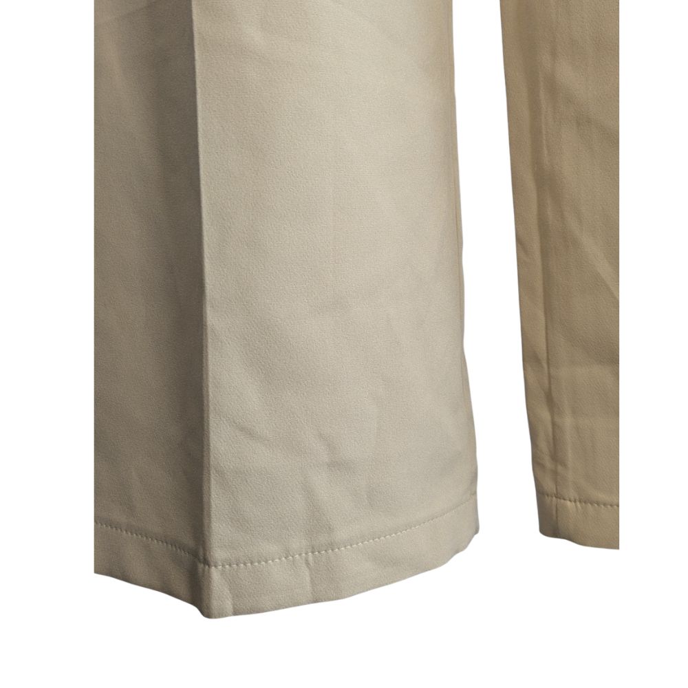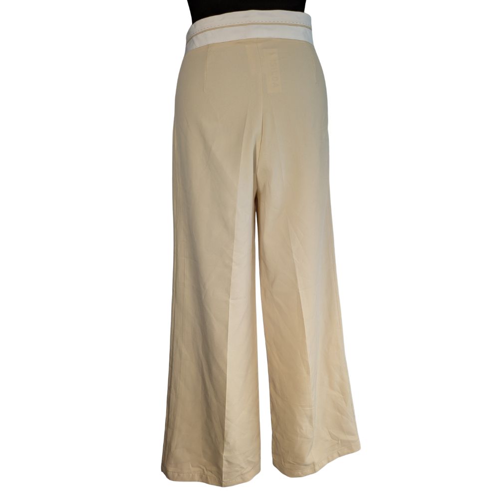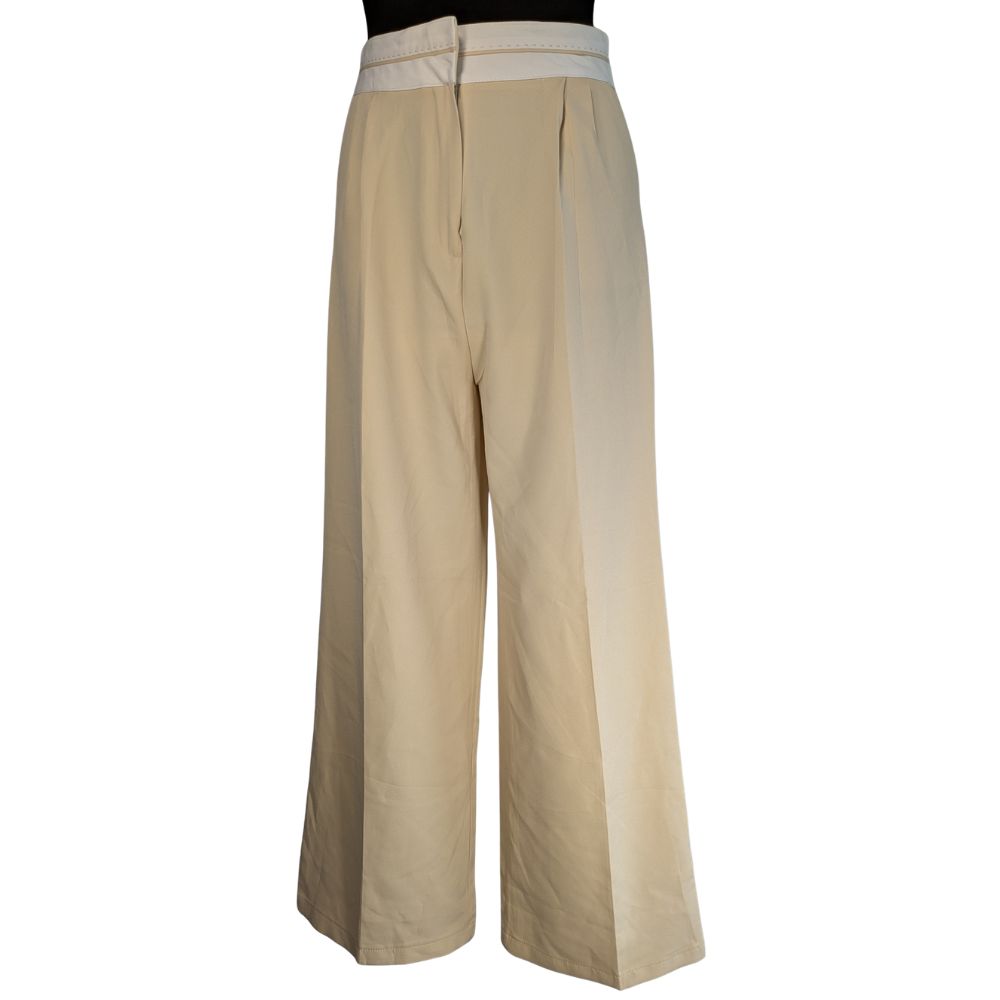 Szerokie nogawki o imponującej szerokości 29 cm na dole, wspaniale wydłużają nogi i pięknie pracują w ruchu. Materiał, z którego uszyto spodnie, to sprężysta mieszanka poliestru (95%) i lycry (5%). Tkanina jest miękka, lejąca i odporna na zagniecenia, co sprawia, że zachowasz nienaganny wygląd przez cały dzień. Tył spodni pozostaje gładki i minimalistyczny.