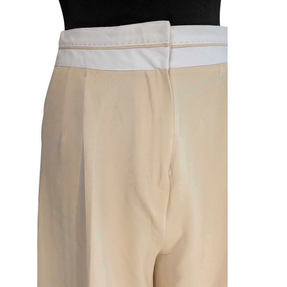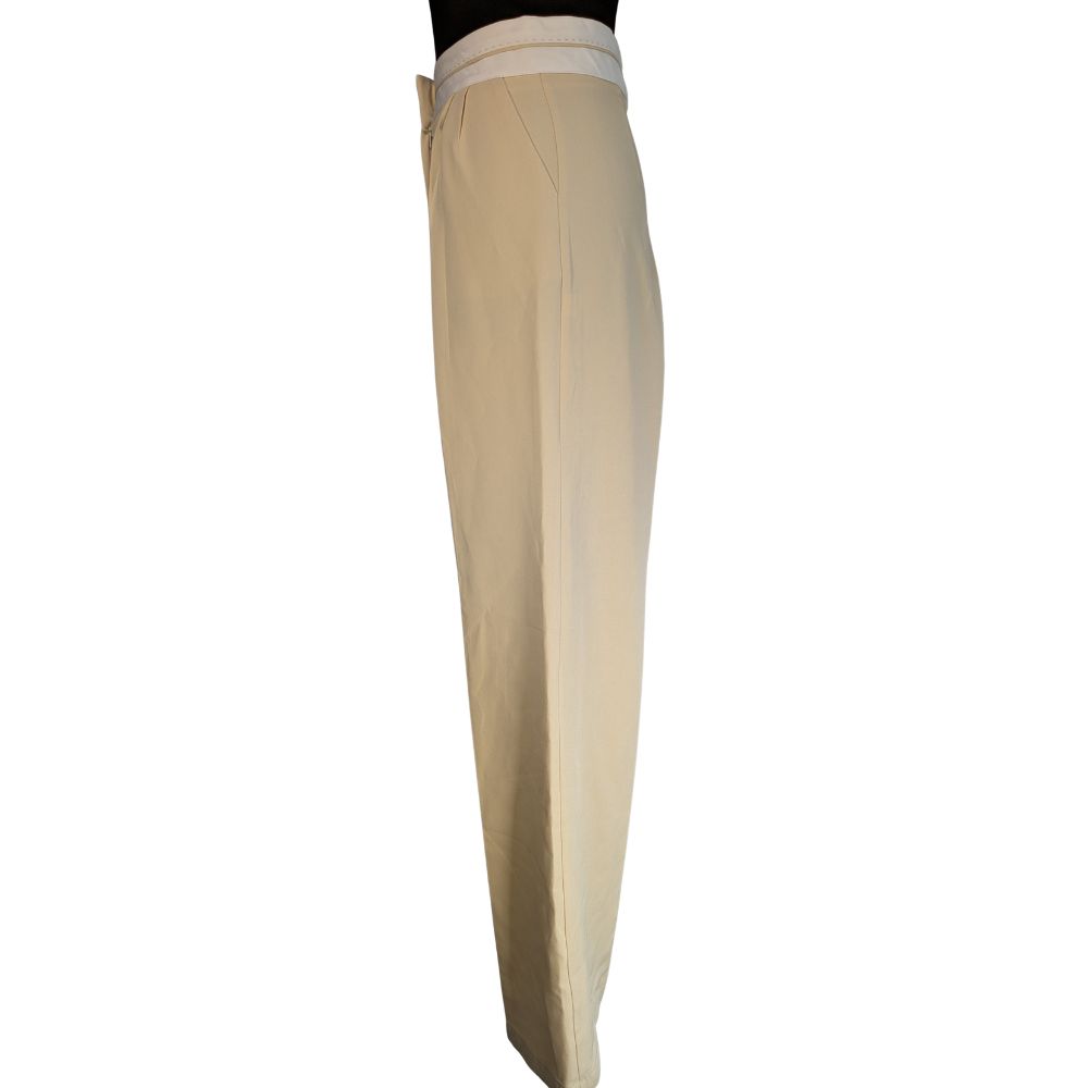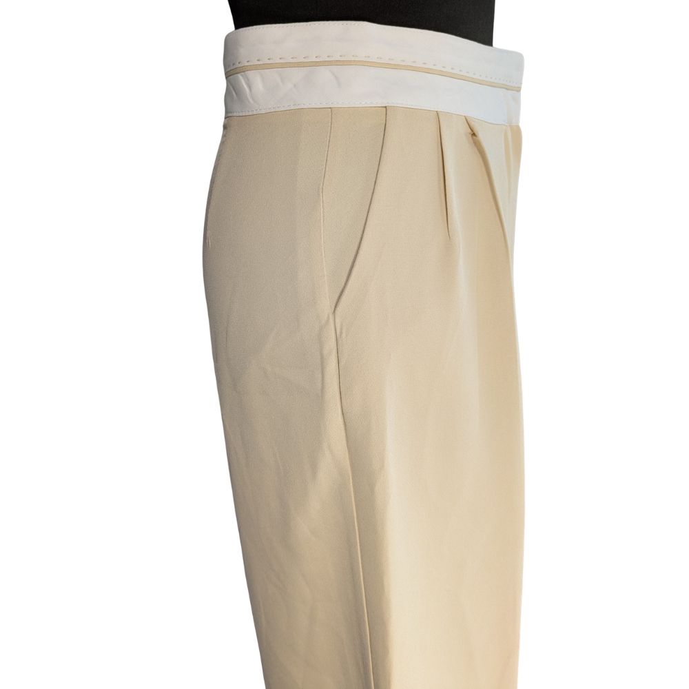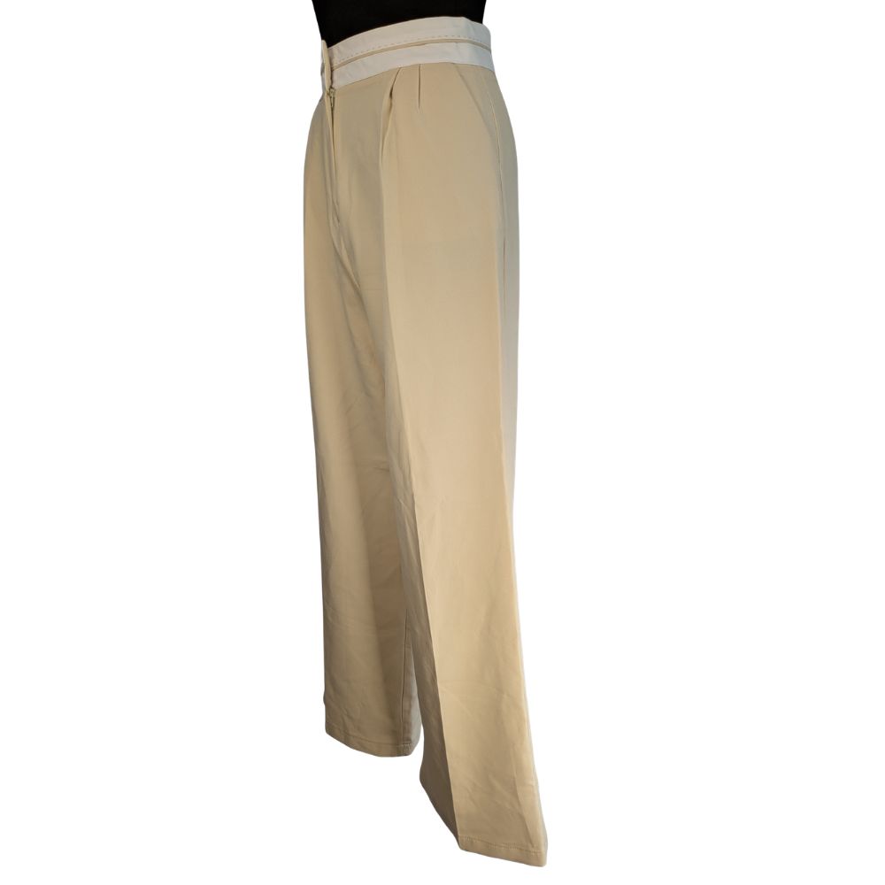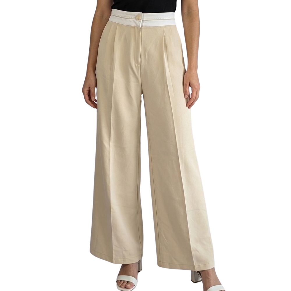 Głównym atutem tego modelu jest przemyślana konstrukcja wysokiego stanu. Został on zaakcentowany szerokim, białym pasem zapinanym na guzik, co optycznie wyszczupla talię (34 cm szerokości na płasko) i pozwala na noszenie bluzek wpuszczonych do środka. Estetyczne zaszewki z przodu dodają spodniom objętości w biodrach, zapewniając swobodę, a wpuszczane kieszenie boczne podnoszą ich funkcjonalność.