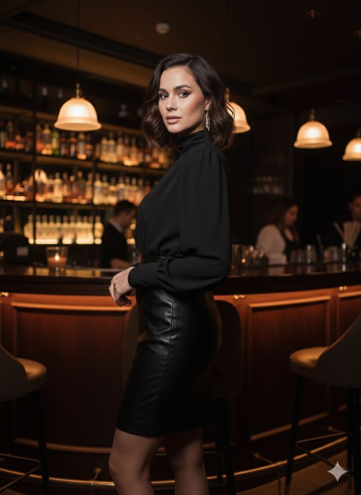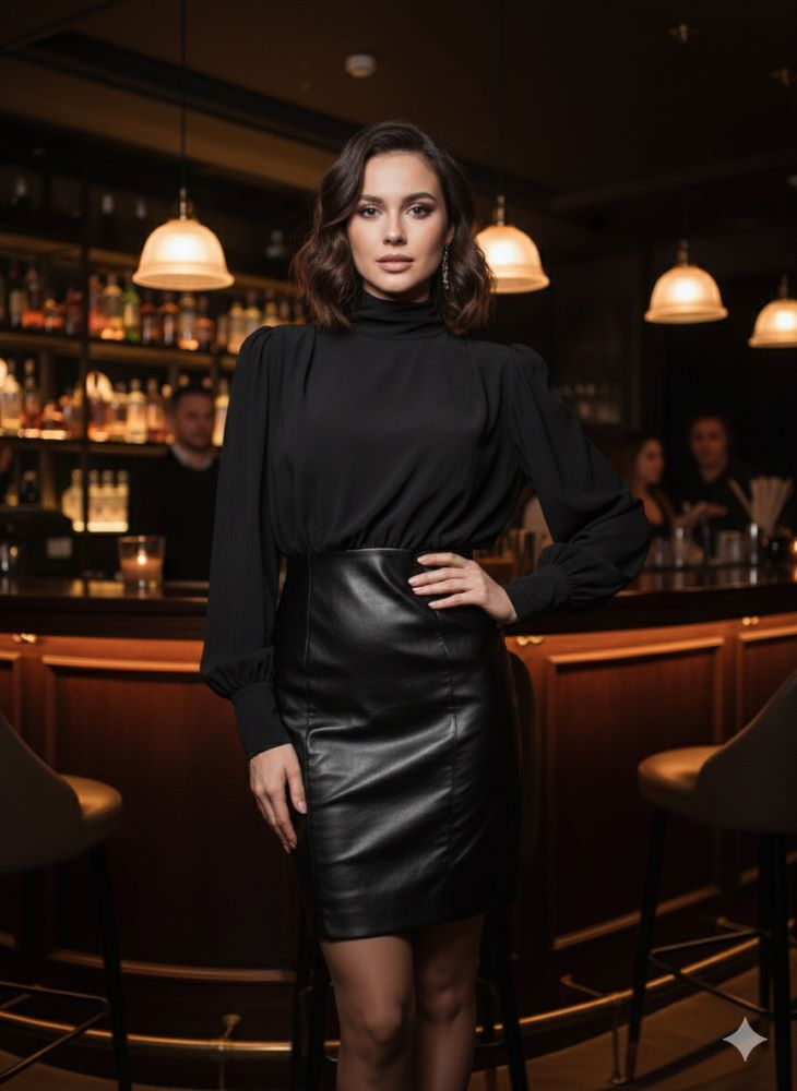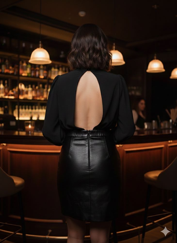 Odkryj mistrzowskie połączenie klasyki z drapieżnym stylem rockowym. Sukienka od ASOS Design to unikatowa konstrukcja imitująca zestaw: zwiewna bluzka z krepy ze stójką oraz ołówkowa spódnica z lśniącej ekoskóry. Największym atutem modelu jest głębokie wycięcie typu keyhole na plecach, które zmysłowo odsłania ciało, zachowując przy tym pełną klasę. Kontrast faktur (mat vs błysk) tworzy kompletną kreację, która nie potrzebuje wielu dodatków, by robić wrażenie.