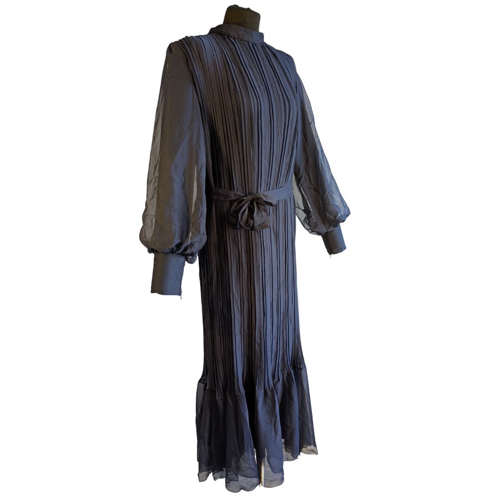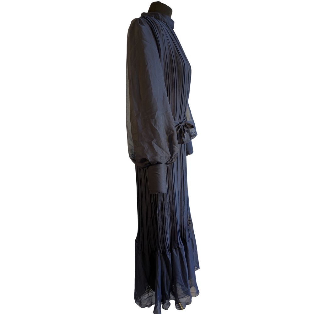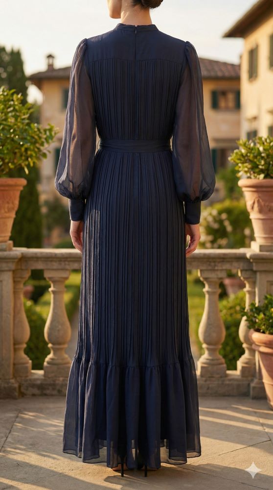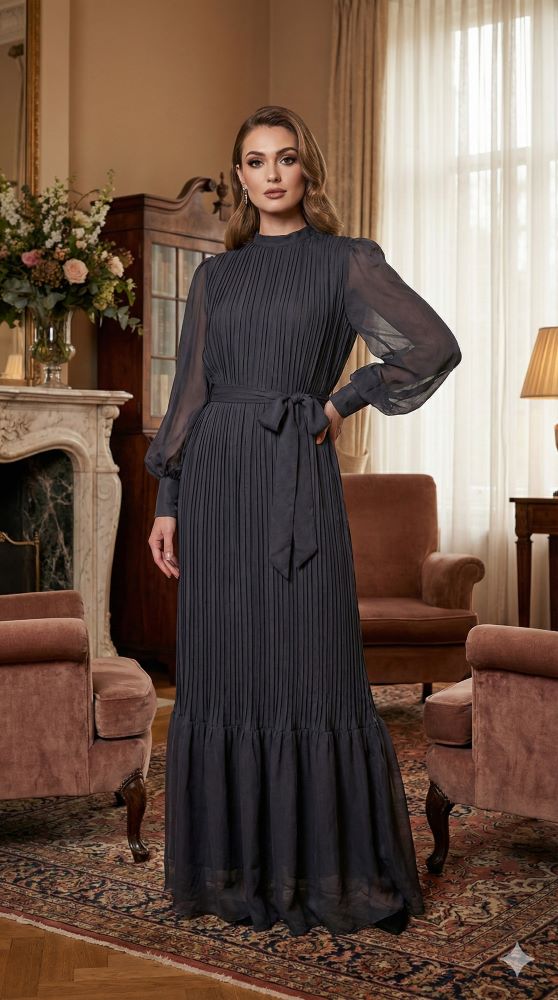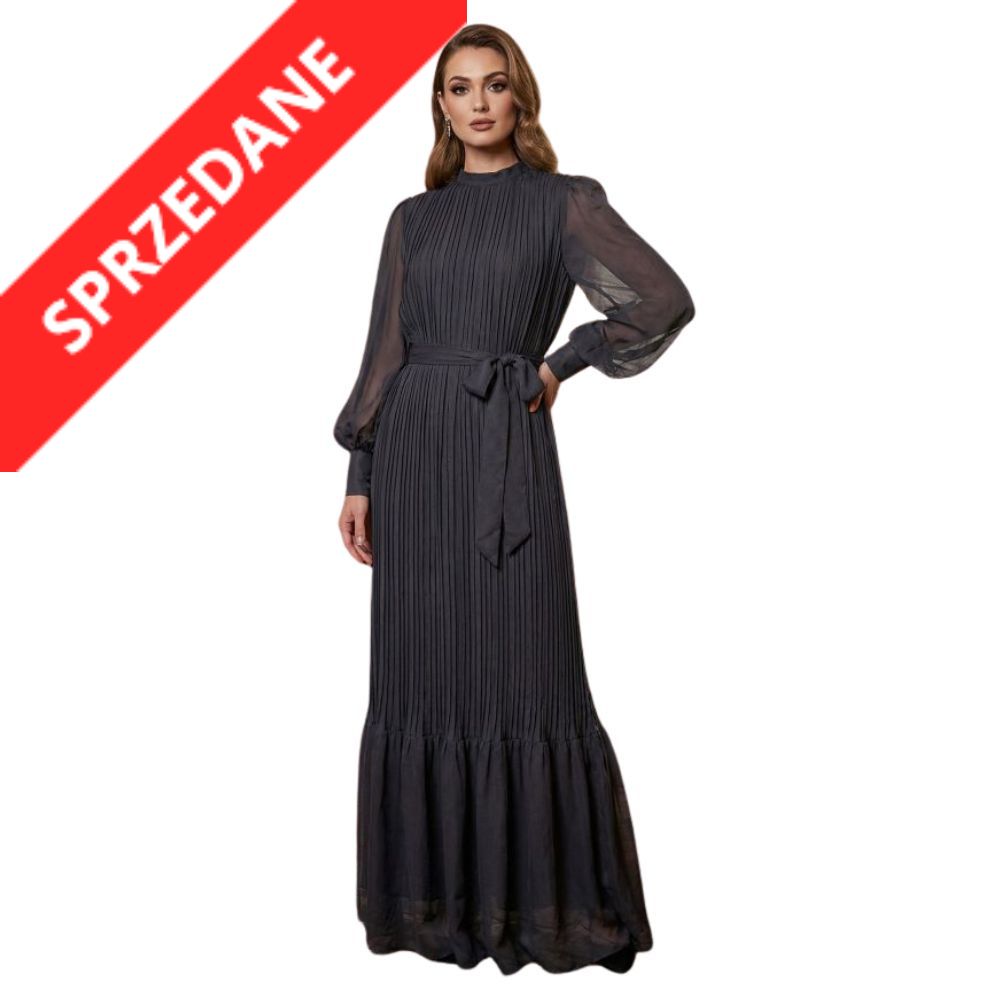Odkryj wyjątkowe połączenie klasycznej elegancji i nowoczesnej formy z sukienką maxi od marki Enderon. To propozycja dla kobiet, które poszukują kreacji wyrafinowanej, a zarazem pełnej lekkości. Głęboki, grafitowy odcień w zestawieniu z misternie plisowaną strukturą materiału tworzy dynamiczną całość, która spektakularnie pracuje przy każdym kroku. Półtransparentne rękawy zakończone mankietami oraz subtelna stójka dodają projektowi szlachetności, czyniąc go idealnym wyborem na uroczyste kolacje, gale czy eventy biznesowe.