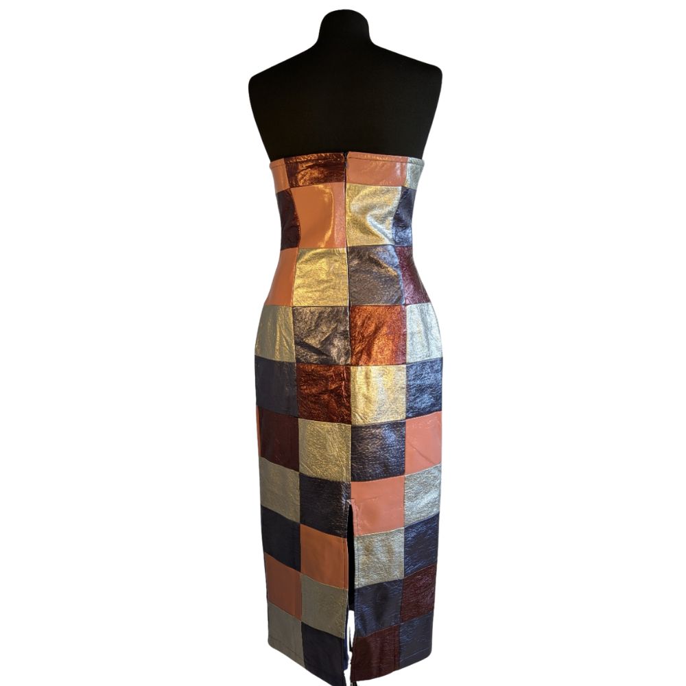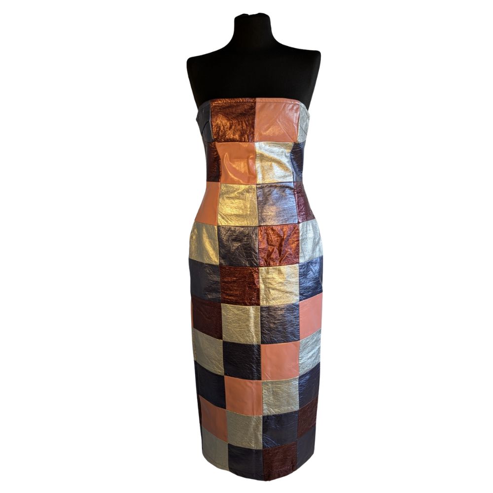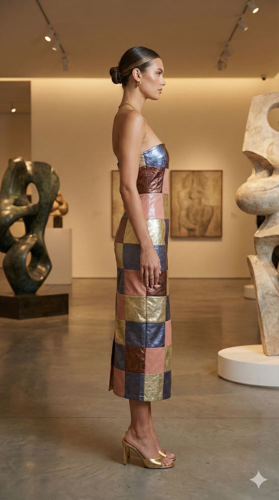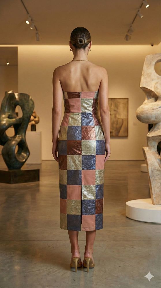 Postaw na absolutny blask i bezkompromisową oryginalność z sukienką marki Annorlunda. Ten model to prawdziwy majstersztyk nowoczesnego krawiectwa, łączący w sobie unikalną strukturę patchworku z metalicznym, wielowymiarowym wykończeniem. Każdy element mozaiki odbija światło pod innym kątem, tworząc hipnotyzujący efekt wizualny przy każdym ruchu. Fason bandeau w wydaniu ołówkowym doskonale modeluje sylwetkę, czyniąc tę kreację idealnym wyborem dla kobiet, które pragną dyktować trendy i przyciągać spojrzenia.