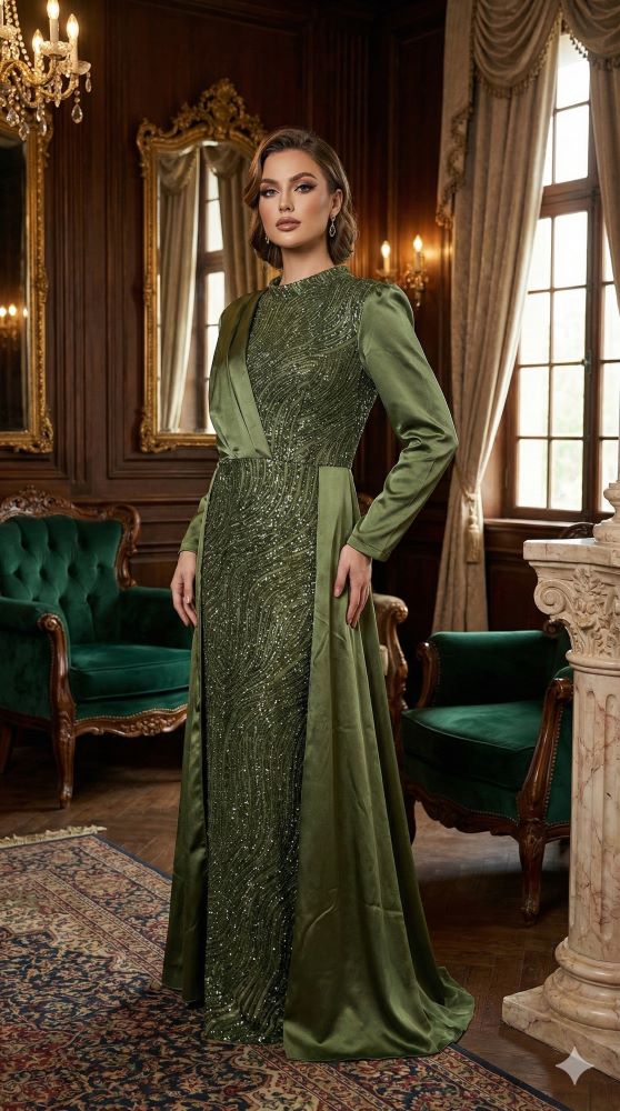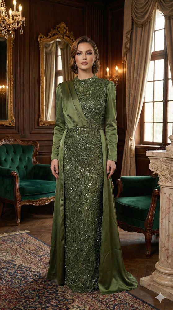 Poczuj się wyjątkowo w zjawiskowej kreacji od Mihir Istanbul. Ta suknia to mistrzowskie połączenie szlachetnej, oliwkowej satyny z tkaniną brokatową, która tworzy efekt "płynnego blasku" przy każdym ruchu. Zabudowany dekolt typu stójka oraz misternie drapowana, asymetryczna zakładka na biuście nadają sylwetce dostojeństwa, jednocześnie optycznie ją wysmuklając. To propozycja stworzona na czerwony dywan, gdzie liczy się każdy detal.