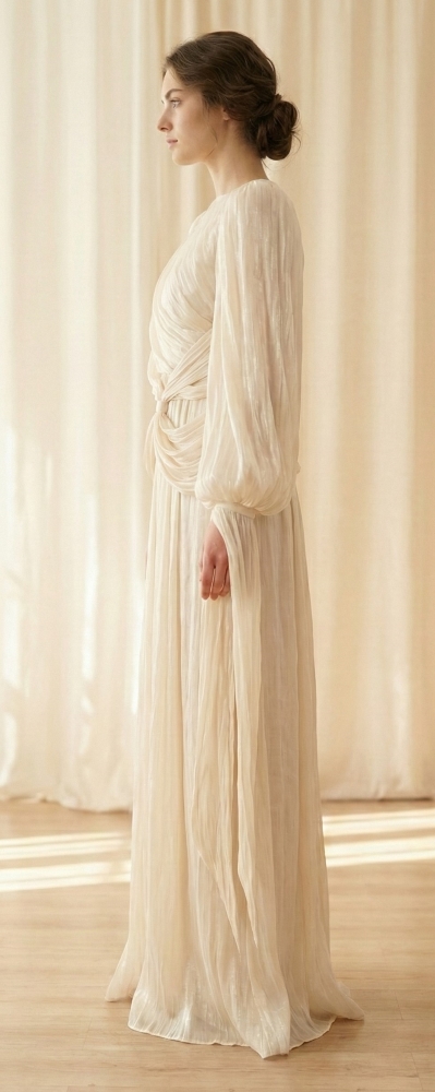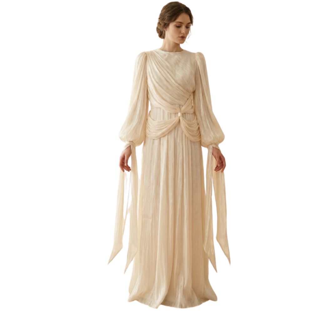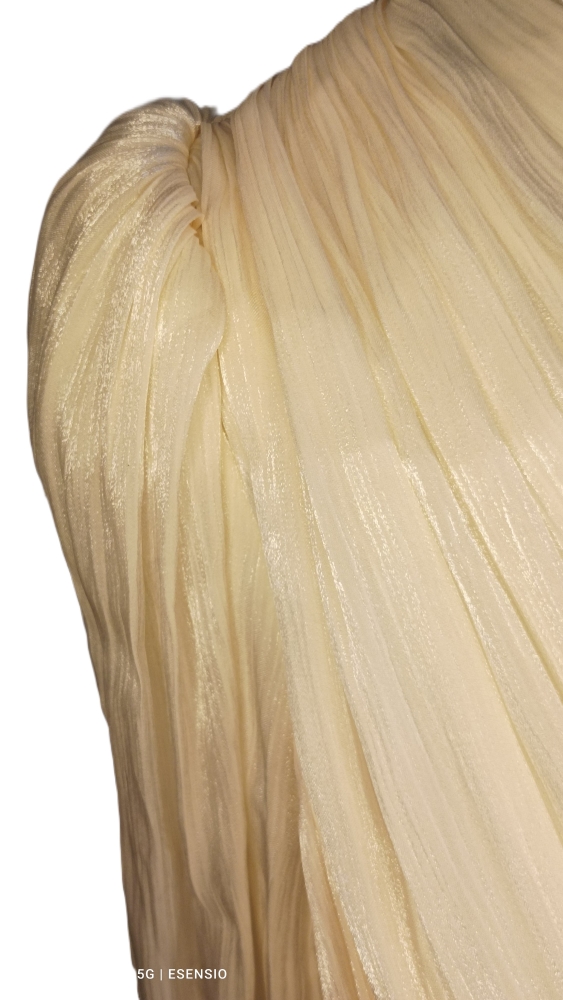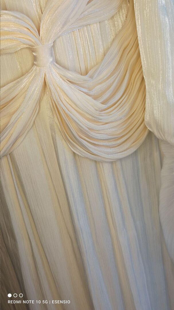 Poczuj się olśniewająco w wyjątkowej kreacji od Mihir Istanbul. Ta suknia w odcieniu szampana to kwintesencja nowoczesnej elegancji. Wykonana z unikalnej, "gniecionej" tkaniny o subtelnym połysku, która zjawiskowo mieni się przy każdym ruchu. Największym atutem modelu są kunsztowne drapowania zbiegające się w talii w efektowny węzeł. Taki zabieg nie tylko zdobi, ale inteligentnie modeluje sylwetkę, zapewniając pewność siebie podczas najważniejszych uroczystości.