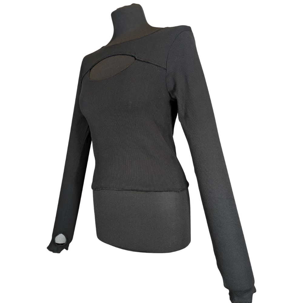 Największym atutem tego modelu jest funkcjonalny otwór na kciuk (thumbhole) w mankietach. Ten stylowy detal nadaje całości nowoczesnego, sportowego sznytu, a jednocześnie jest niezwykle praktyczny – zapobiega podwijaniu się rękawów pod kurtką czy marynarką. Długość 47 cm idealnie współgra ze spodniami i spódnicami o wysokim stanie.