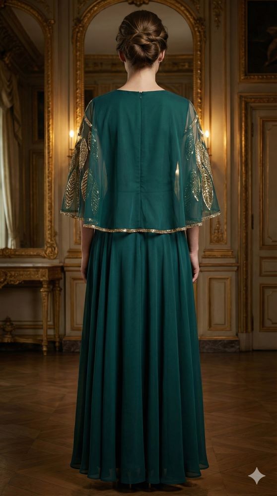 Przedstawiamy zjawiskową suknię wieczorową, która przenosi w czasy luksusowych przyjęć w stylu Great Gatsby. Głęboki, hipnotyzujący odcień szmaragdowej zieleni stanowi idealne tło dla kunsztownych, złotych aplikacji wykonanych z tysięcy koralików i cekinów. Półtransparentne rękawy typu motylek oraz dekolt w kształcie litery V tworzą sylwetkę pełną dostojeństwa i kobiecego wdzięku. To kreacja, która nie potrzebuje biżuterii – ona sama nią jest.