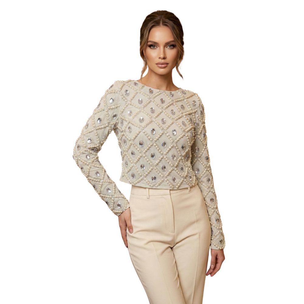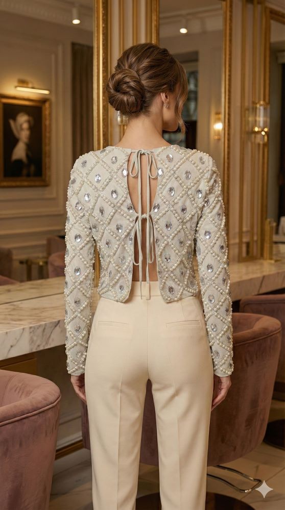 Postaw na spektakularny efekt z unikatowym żakietem od ASOS. To nie jest zwykły element garderoby – to biżuteryjna "zbroja", która z całą pewnością skupi na Tobie wszystkie spojrzenia. Całość wykonana na delikatnej, miętowej siateczce, która została misternie pokryta geometryczną siecią z perełek i dużych, lśniących kryształów. Największym atutem modelu są niemal całkowicie odkryte plecy z eleganckim wiązaniem, co dodaje stylizacji zmysłowości i lekkości.