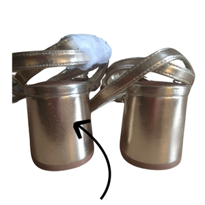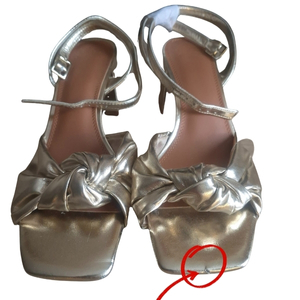 Buty są nowe i nienoszone. Sprzedawane w obniżonej cenie ze względu na wady kosmetyczne: widoczne zmatowienia i otarcia złotej powłoki na tyłach obcasów oraz drobne odpryski metalicznej folii na krawędziach nosków. Dzięki blaskowi złota, mankamenty te "gubią się" i są mniej widoczne podczas użytkowania.